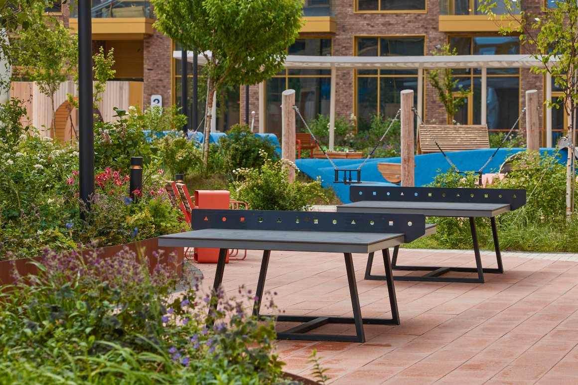 A second-level terrace is dedicated to adult recreation. It features shaded seating areas, while the space beneath hosts a small open library, suspended chairs, and communal tables. The rooftop terrace extends the courtyard vertically, offering sun loungers and seating with panoramic views of the Moscow River.
