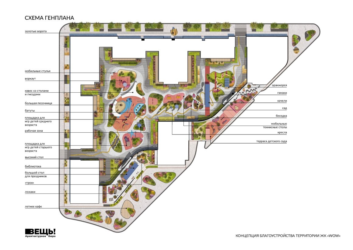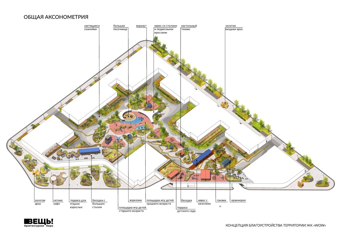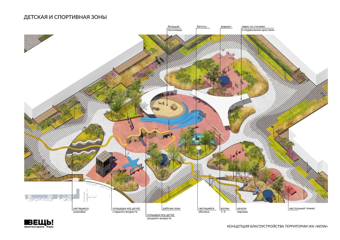 VESCH!:The courtyard of the WOW residential complex is conceived as an immersive landscape composition, where planning geometry, art references, and everyday functions are interwoven into a unified spatial narrative. The project’s name reflects the authors’ intention to evoke an emotional response — an architectural “wow” effect — comparable to the expressive language of 20th-century abstract art.