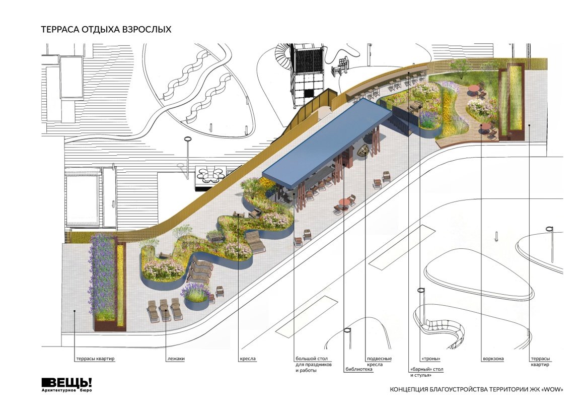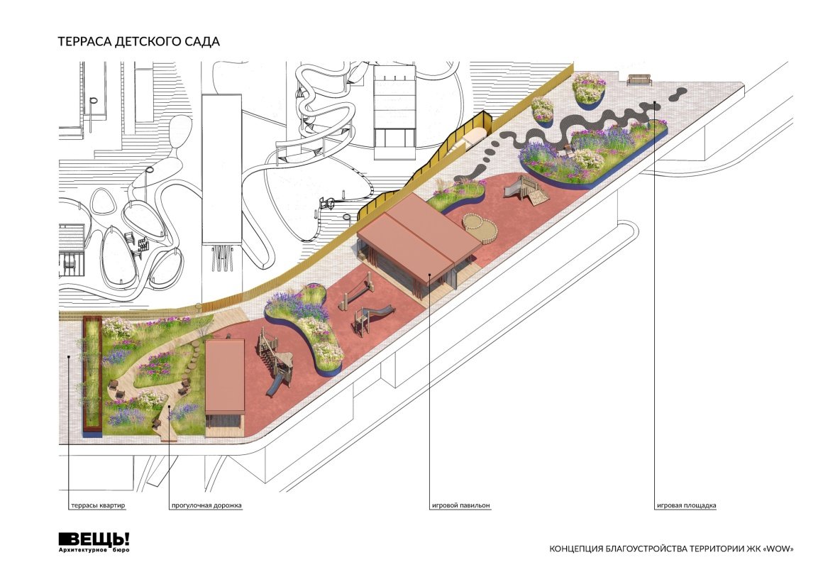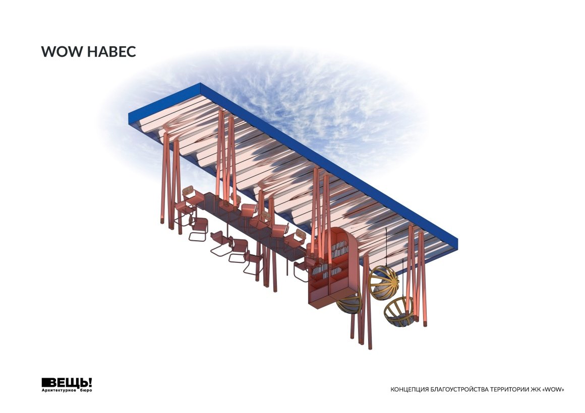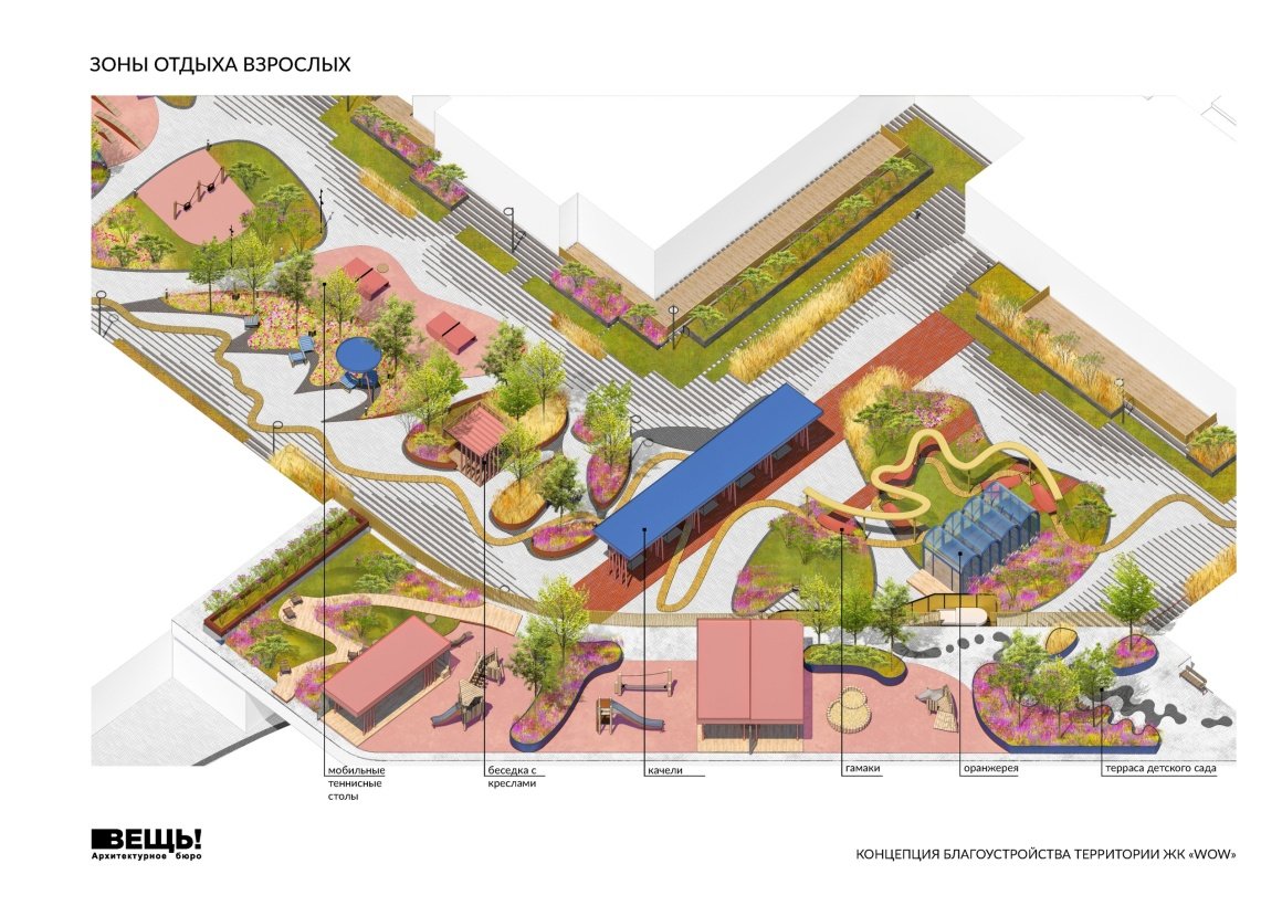VESCH!:The courtyard of the WOW residential complex is conceived as an immersive landscape composition, where planning geometry, art references, and everyday functions are interwoven into a unified spatial narrative. The project’s name reflects the authors’ intention to evoke an emotional response — an architectural “wow” effect — comparable to the expressive language of 20th-century abstract art.