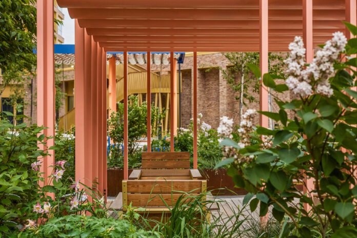 Landscape design plays a key role in creating microclimatic comfort and spatial intimacy, combining expressive planting accents with calmer green compositions within the dense urban context.