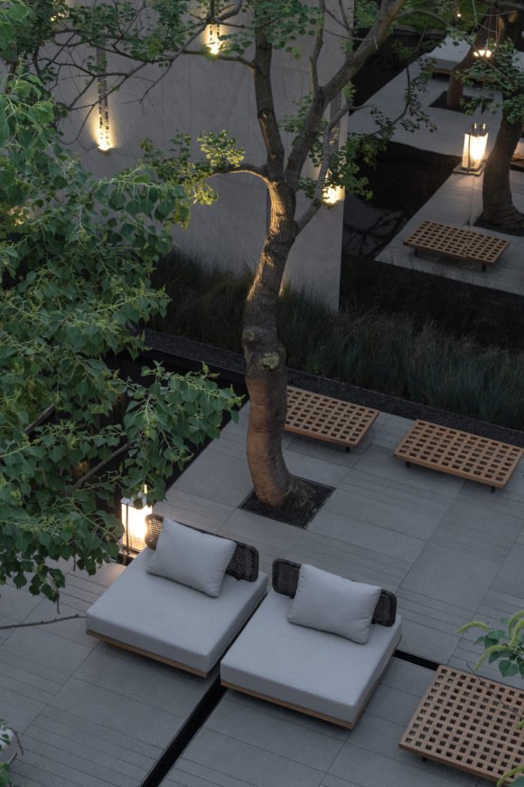 通过电梯抵达二层庭院天井空间,乔木的婆娑身姿和潺潺流水景墙,静谧的倒映在水景之间。
