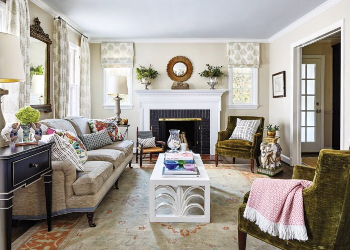 The living room welcomes visitors to the home. Nuanced neutrals set a sophisticated tone, but durability rules the day. A performance fabric from Perennials covers the custom sofa; its contrasting trim elevates the look. A “very forgiving” velvet covers two armchairs. “Nothing in the house is too formal,” the designer notes. “I like things that feel refined, but I don’t want people to be afraid to sit down anywhere.”