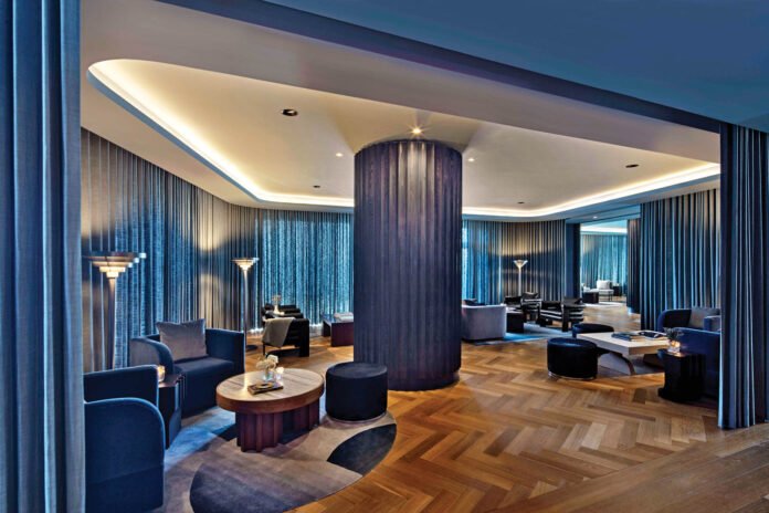 Part of Hilton’s Curio Collection, The Morrow Hotel engaged New York–based INC Architecture & Design for its F&B spaces: Le Clou, a first-floor restaurant; Vesper, an 11th-floor cocktail lounge; and Upstairs, the rooftop bar—more than 19,000 square feet in total. The first, a modern take on the traditional French brasserie, features an open plan with both the kitchen and wine storage on show. Custom furniture is joined by leather banquettes and circular ceiling fixtures in a gold-tone setting for a luxe but contemporary feel. A midnight-blue palette, centered around plush-velvet lounge chairs and a bar clad in backlit onyx, establishes a sophisticated clubby vibe at Vesper. Taking its cues from the subtle spectrum of a sky at twilight, the penthouse bar frames unobstructed views of the Capitol dome with a wash of soft colors redolent of the magic hour.