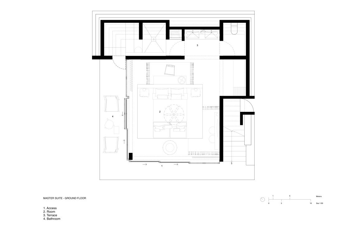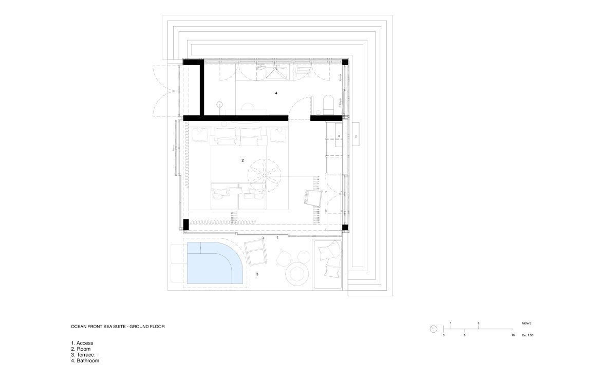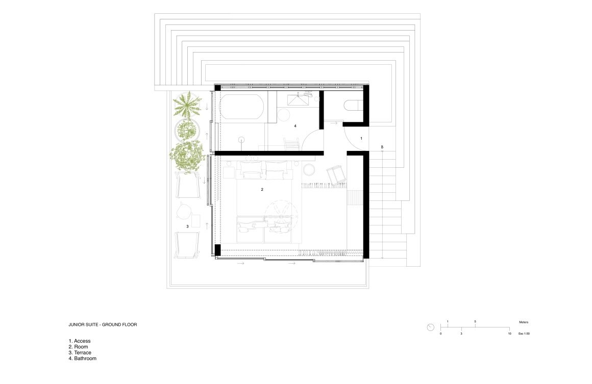 酒店设有 22 间套房,分布合理,确保了私密性和海景。房间由现场建造的压实土堤环绕,形成阶梯状或金字塔状的体量,为房间提供遮荫和隔热保护。这些结构在酒店内营造出各种视觉场景:太平洋的全景,或是周围沙丘和干旱花园的景色。土堤内设有浴室、淋浴间、衣橱和浴缸等服务空间。受前西班牙时期遗迹的启发,这些几何结构与周围有机生长的景观形成鲜明对比。