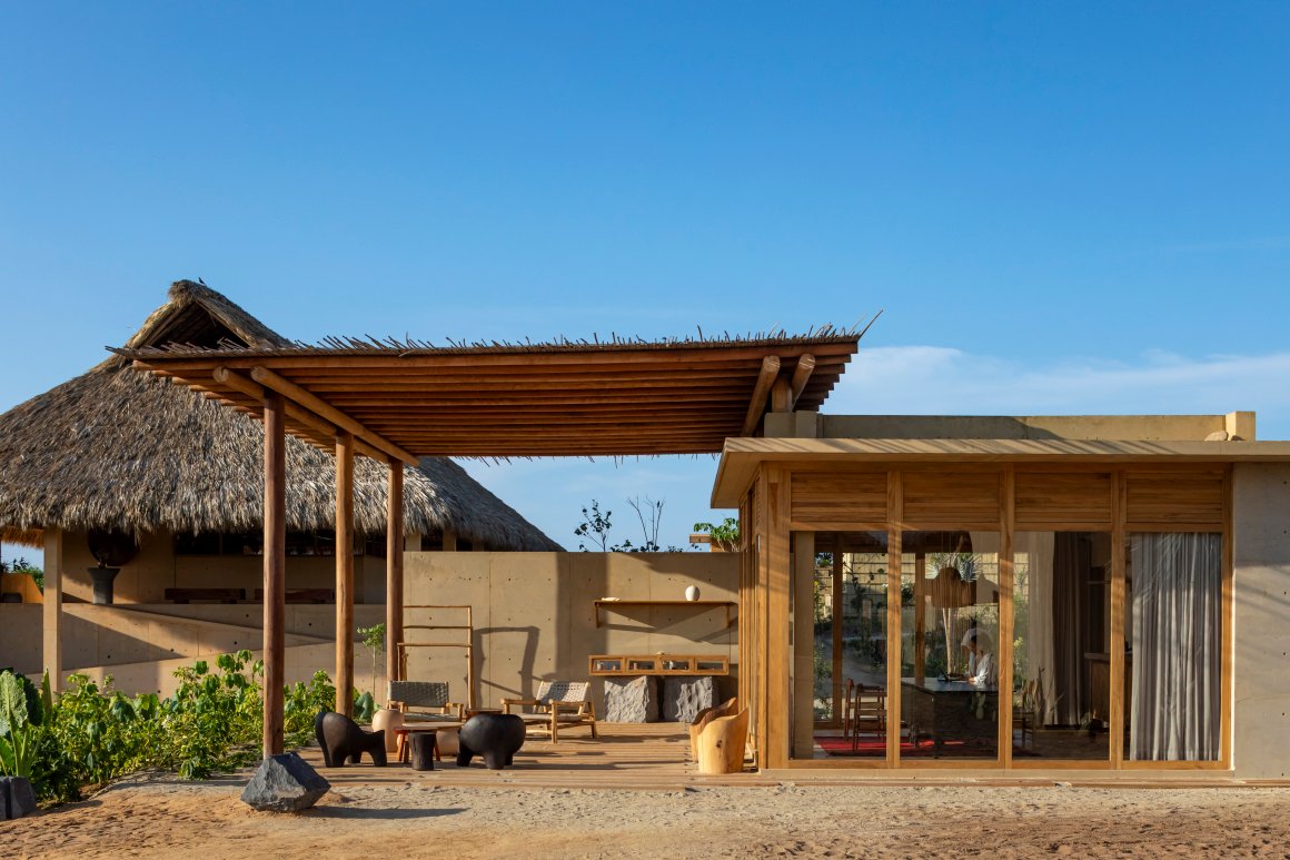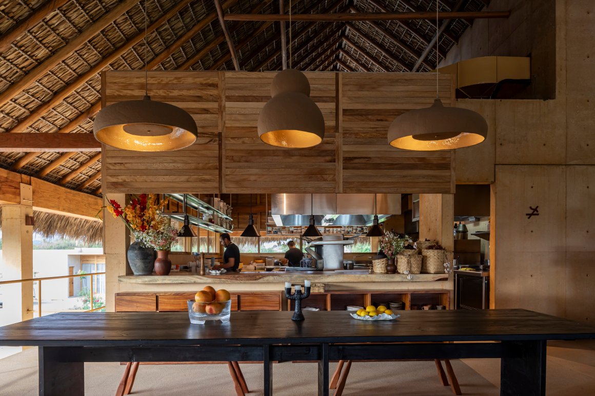 Septimus, the main restaurant—led by chefs Lalo García and Gaby López—fuses the local with the universal, sea with land. Elevated on dunes and surrounded by native vegetation, it is sheltered beneath a monumental ten-meter-high palapa resting on a solid base. This space offers an ascending path reminiscent of a pyramid, conceived as a ceremony that honors fire and the ocean. It transitions from informal, relaxed zones to a formal dining area, where light, fire, and ingredients come together in a ritual gastronomic experience. The design encourages dynamic uses—work, rest, celebration—in a post-pandemic context. Sustainability is evident in the use of reclaimed materials and eco-technologies such as solar panels, constructed wetlands, evapotranspiration filters, and a landscape composed of resilient native species.