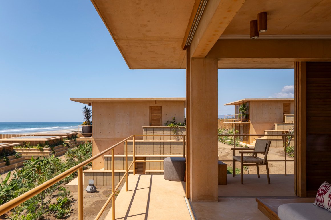 The hotel features 22 strategically distributed suites, ensuring privacy and ocean views. The rooms are framed by compacted earth berms built on-site, providing shade and thermal protection in stepped or pyramidal volumes. These structures create a variety of visual scenes throughout the property: panoramic views of the Pacific, or of the surrounding dunes and arid gardens. Within the berms are service spaces such as bathrooms, showers, closets, and bathtubs. Inspired by pre-Hispanic vestiges, these geometric structures contrast with the organic growth of the surrounding landscape.
