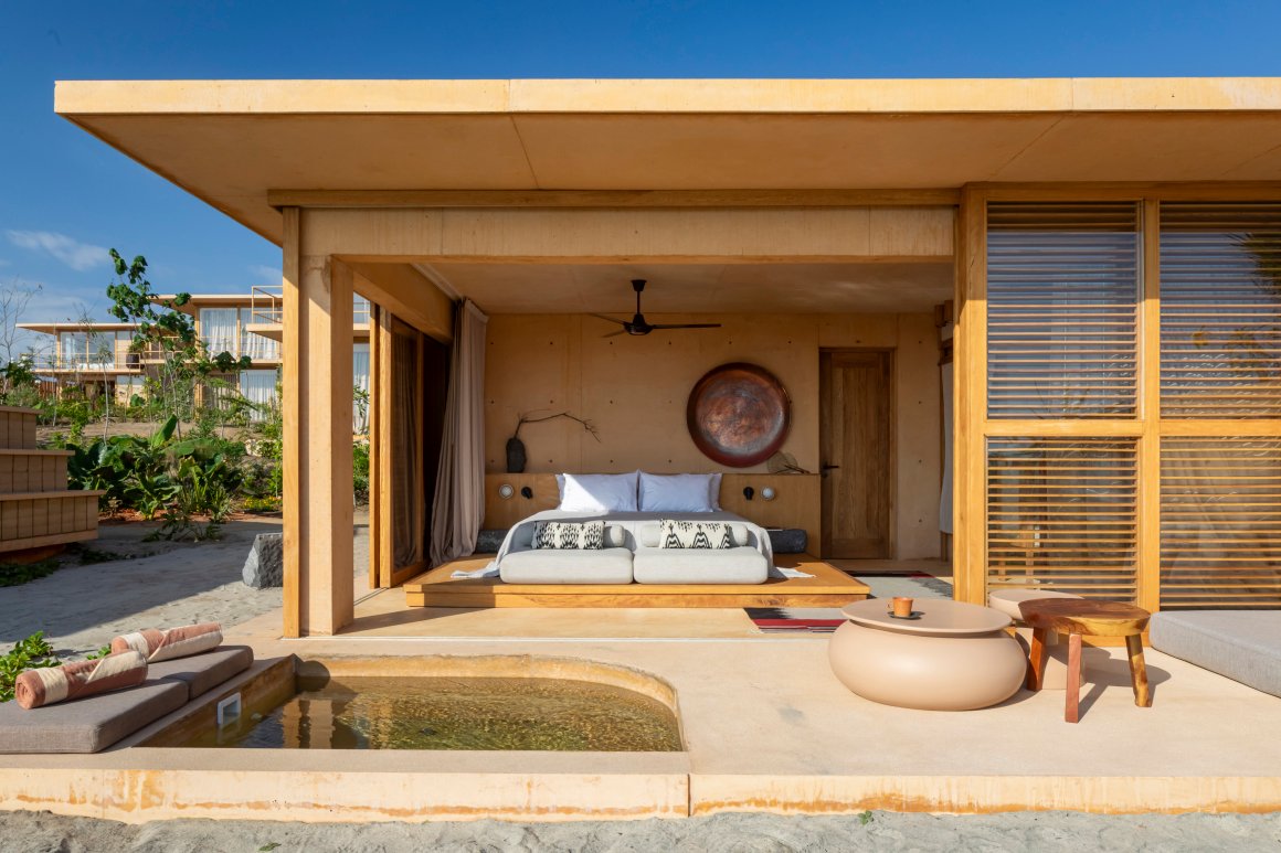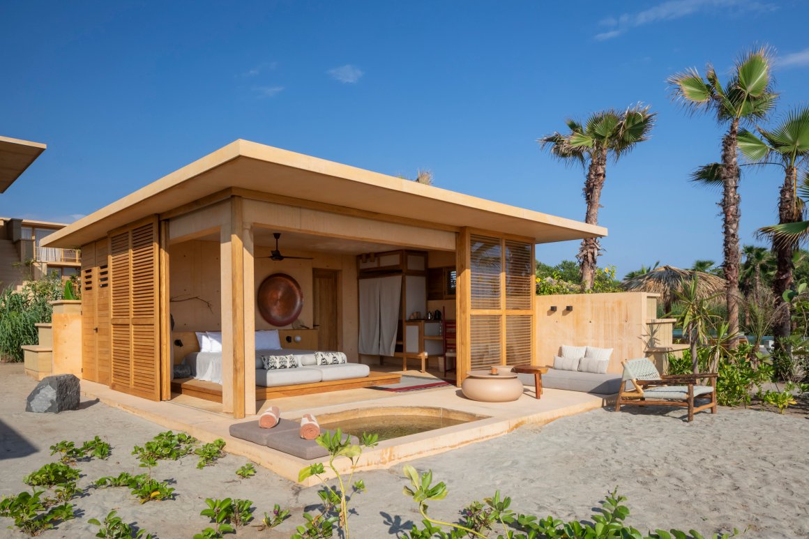 The Wellness Center, named Azumi, enriches the hotel’s offerings as a ritual space designed as a dry garden populated with local desert species. Designed for yoga and contemplation, Azumi features an upper terrace conceived as an observatory for sunset and stargazing in this unique region of the Mexican Pacific. Another area dedicated to yoga, known as the Shala, is distinguished by its singular architectural form—combining a square floor plan with a circular roof supported directly on the sand, generating shaded areas around its perimeter.