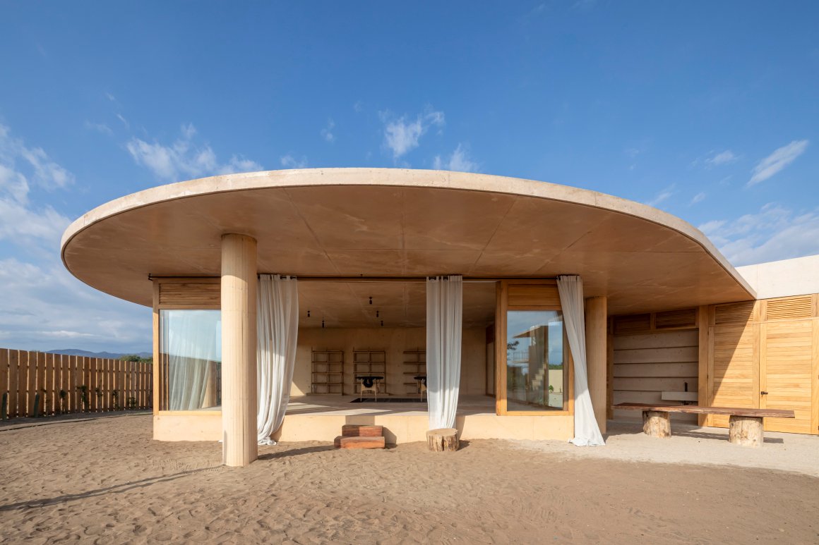 另一个专门用于瑜伽的区域,名为“沙拉”,其独特的建筑形式引人注目——方形的平面布局搭配直接建在沙地上的圆形屋顶,从而在其周边形成了阴凉区域。