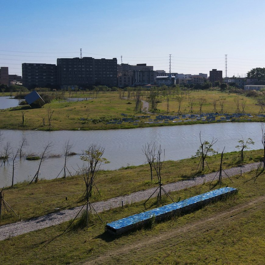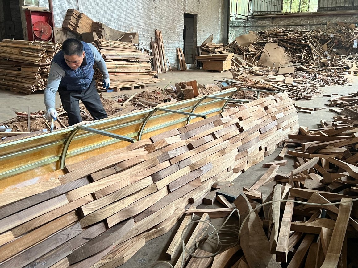 YXDesigners: Longjiang Town in Foshan City’s Shunde District is renowned nationwide for its furniture production. In the yet-to-be-completed Longhu Central Park, YX Designers was invited to design a public art installation for Qianjin Home, a local enterprise in Longjiang. Established forty-five years ago, Qianjin Home has consistently dedicated itself to the art of wooden furniture making, emerging as a distinguished brand in the field. The wood chosen by Qianjin Home originates from North American black walnut trees. These majestic giants are sliced into planks, transported across oceans to Longjiang, and then meticulously carved into furniture components, while the leftover timber is discarded as waste.