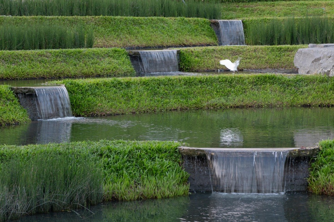 梯田阶梯结构可以分级蓄水和排水,起到减缓径流速度和应对极端天气的作用。景观植物取代了传统的梯田农作物成为主角,木贼等水生植物起到了滞留与净化水质的作用;大叶油草与金红羽狼尾草则以它们独特的形态,引导空间布局与视线流动。浅水面与高草的组合为鹭类水鸟、蛙类等提供了类似水田的生境,丰富了生态系统的层次。在有限的空间范畴内,绿色的软质田坎、厚重的整石台阶与精致的溢水口设计相互映衬,将人工设计之美与自然的和谐韵律相融合,通过细腻的笔触抽象地再现了田园风光,赋予梯田台园以自然气息和诗情画意。