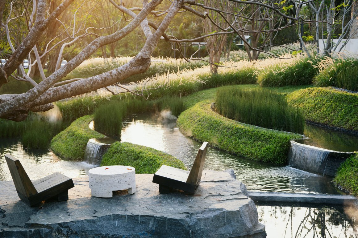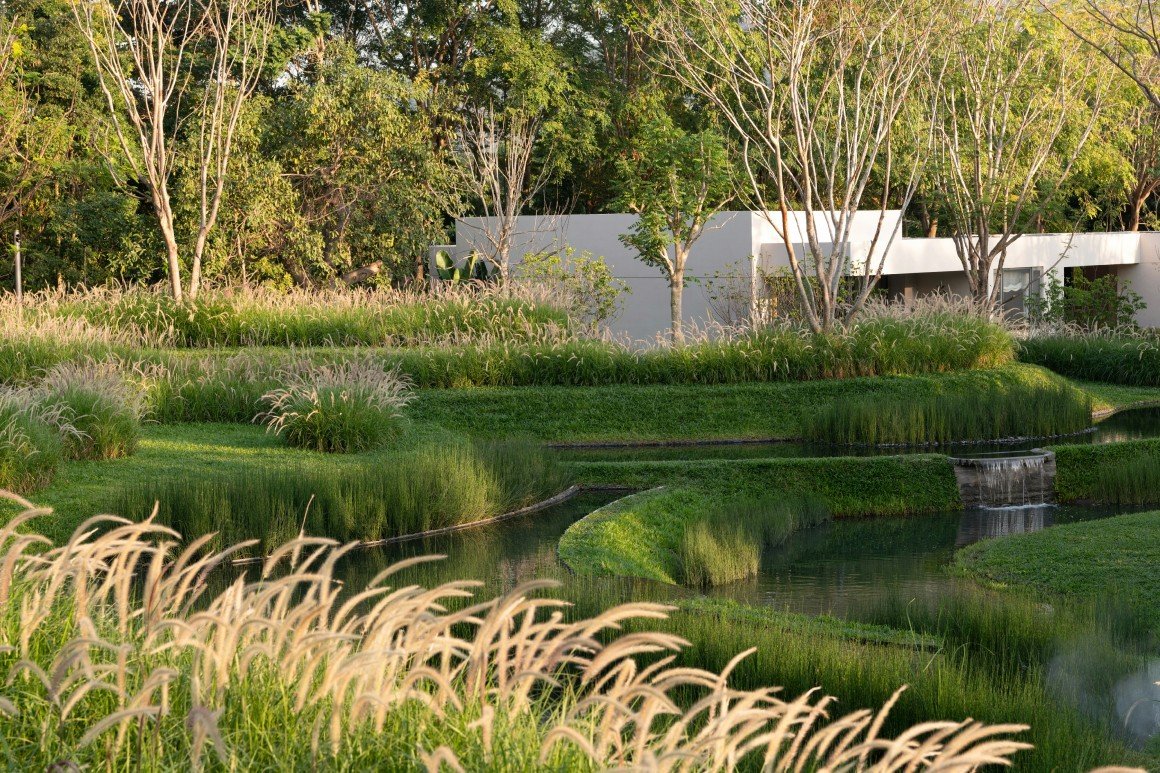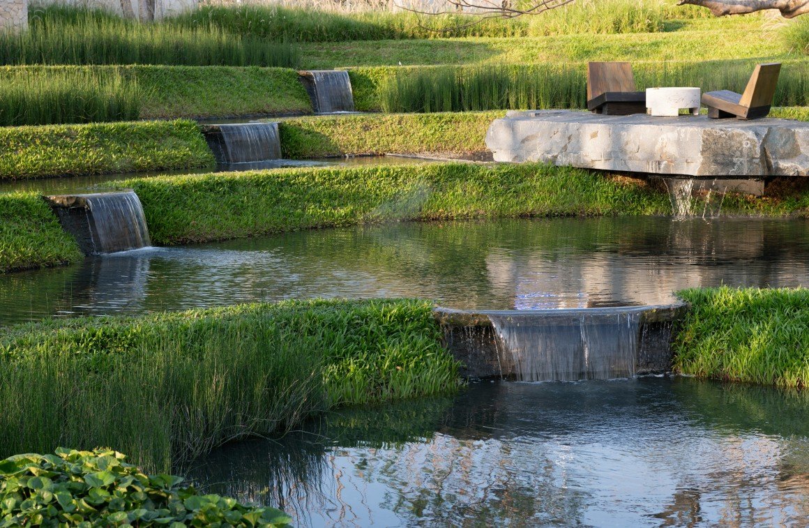 致舍将现状树看做是场地的原住民,保留部分场地原生植被,以其点位为设计布局的依据,进而营造空间的开合与跌落,组织水岸岸线的转折、回廊的围合和路径的穿梭,形成景观空间的骨架。突出展现原状植被的组合排列、姿态、肌理等,让自然作画,使人体验感知“隐逸绿岛-翠泽梯田台园-穿林水花园-沙生艺术花园-绿野热带林院”一系列如画的景观,实现了从面向城市界面开放的公共空间到内向性回廊庭院的转换。同时,致舍也通过现代自然主义的设计手法,将农业生产性景观中山地梯田的水文过程在城市空间中进行景观艺术化的转译,这一过程是美学与自然生态过程的融合。
