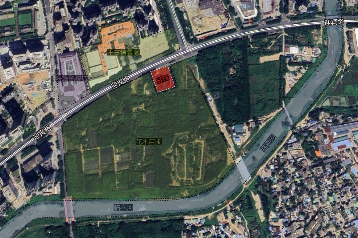 项目地处三亚市吉阳中央商务区东部的海罗片区,占地约2公顷。原状是城市中心借由花木苗圃而保留下来的一块难得的野趣之地。南侧的临春河与三亚河汇流后入海;东南可望的海罗岭则是三亚山区的重要组成部分。场地北侧是城市主要干道迎宾路,与热闹的海旅免税城和三亚千古情景区一路之隔。