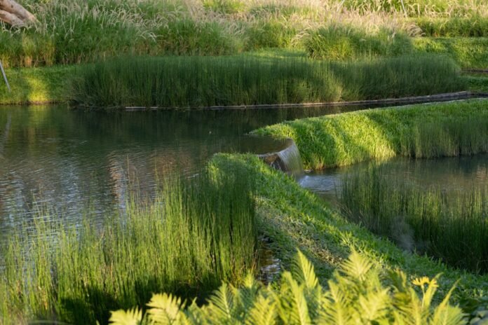 The Terrace Garden is a poetic pastoral scene, drawing wisdom from the agricultural use of water and soil, inspired by the Yahuo Terraces of Hainan. It is a harmonious blend of blue and green, with half of the area dedicated to water and the other half to grass. The stepped structure of the terraces allows for graded water retention and drainage, helping to slow runoff and mitigate extreme weather conditions. Here, landscape plants replace traditional terrace crops as the main feature. Aquatic plants play a role in water retention and purification, while grasses such as Axonopus compressus and Pennisetum setaceum ‘Rubrum’ guide spatial layout and visual flow with their unique forms. The combination of shallow water and tall grasses creates a habitat similar to paddy fields for egrets, frogs, and other aquatic species, enriching the ecosystem’s diversity.