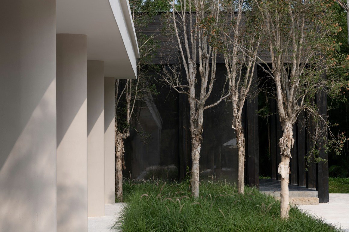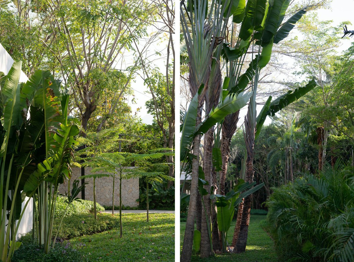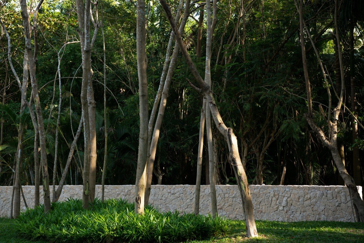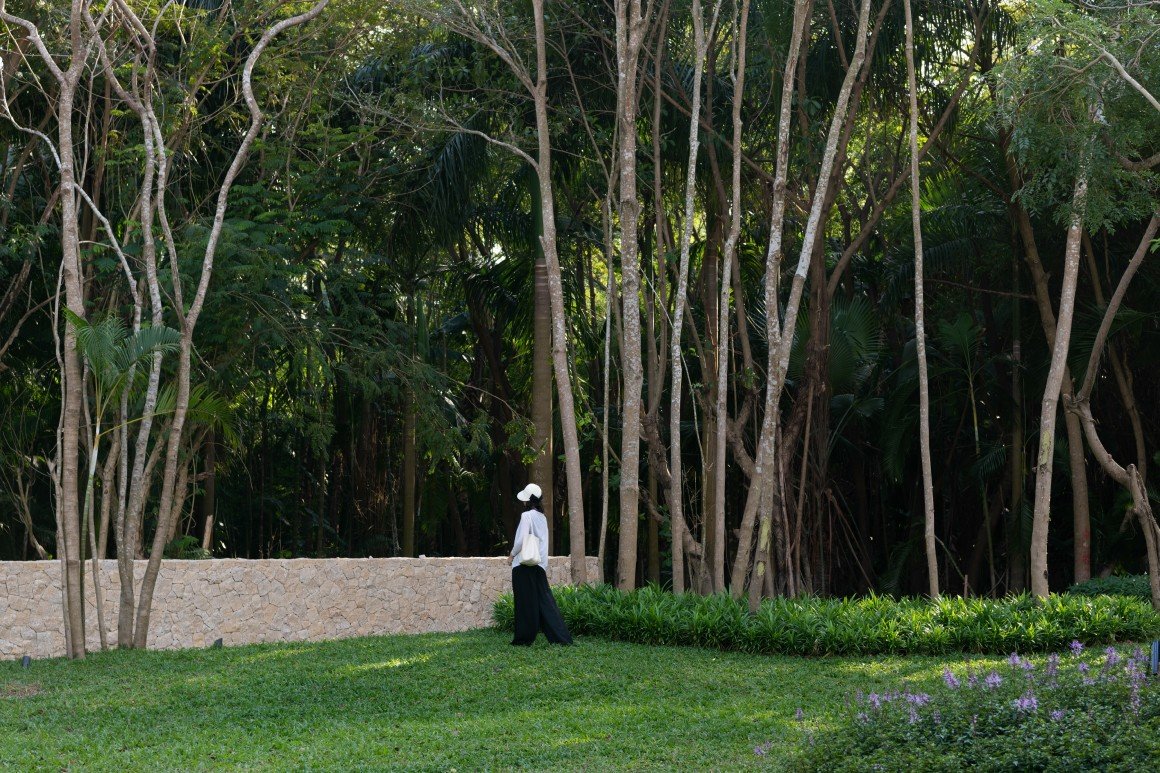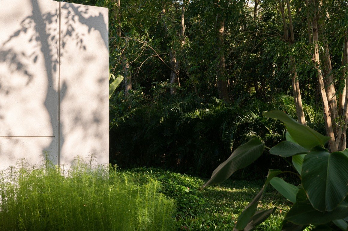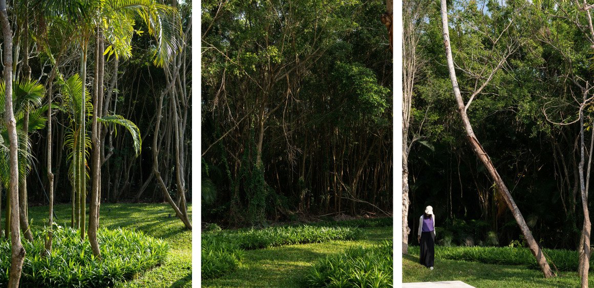 建筑南端延伸出一片铺装和草坪空间,用于户外休憩和活动。以密林为背景,两段平直的矮石墙巧妙地暗示和界定了花园边界,并与天光树影形成对话。其间,选择性保留的现状树,品种和姿态各异,成为林院空间的主体,突出野趣。细杆斜瓢的木棉、朴树、小叶榄仁等杂木林下,是开放通透的缀花草地;而粗壮密闭的印度紫檀和大榕树林下,则是起伏错落的散尾葵、雪茄竹芋等林荫灌丛。