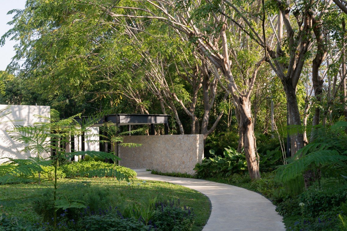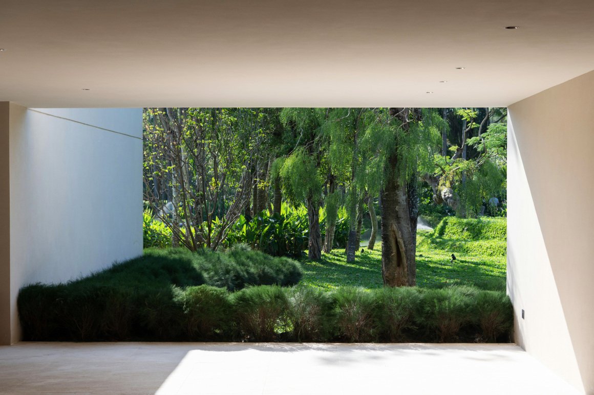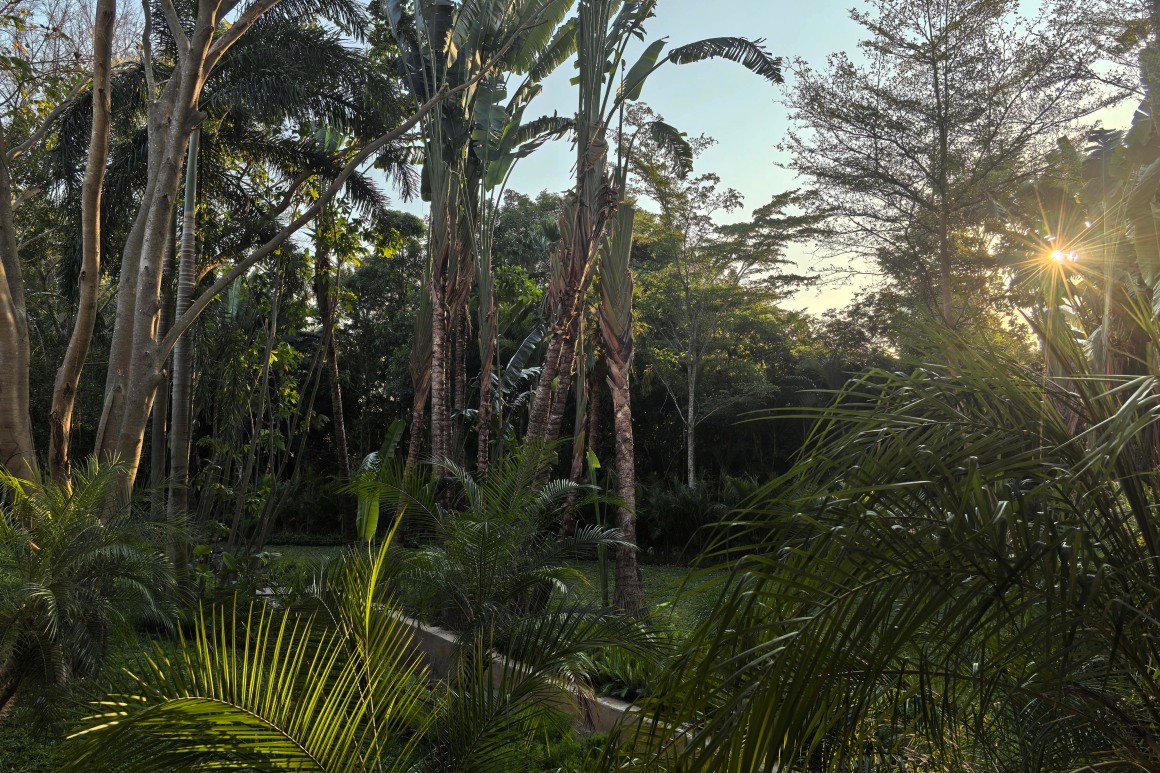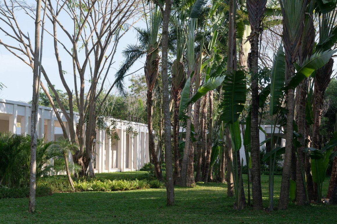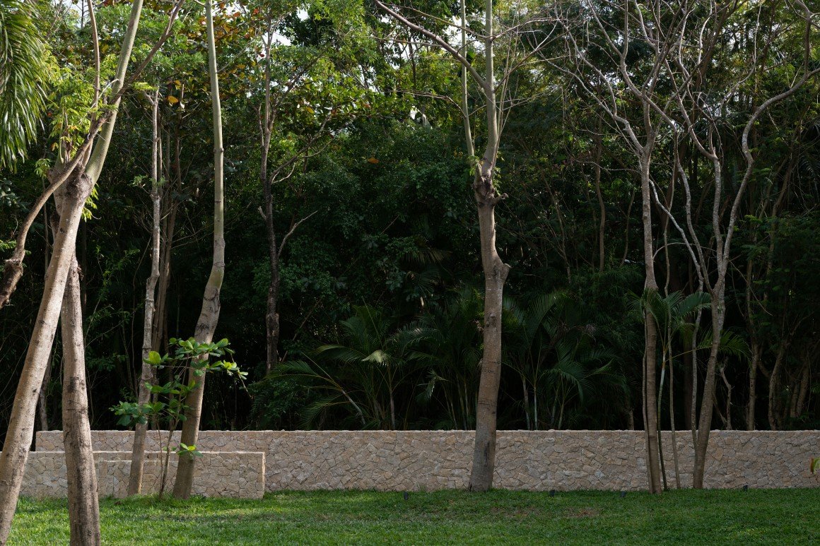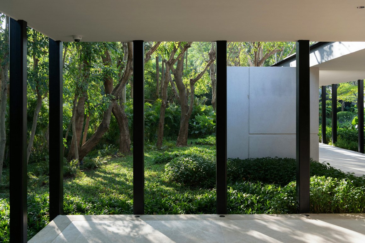 建筑南端延伸出一片铺装和草坪空间,用于户外休憩和活动。以密林为背景,两段平直的矮石墙巧妙地暗示和界定了花园边界,并与天光树影形成对话。其间,选择性保留的现状树,品种和姿态各异,成为林院空间的主体,突出野趣。细杆斜瓢的木棉、朴树、小叶榄仁等杂木林下,是开放通透的缀花草地;而粗壮密闭的印度紫檀和大榕树林下,则是起伏错落的散尾葵、雪茄竹芋等林荫灌丛。
