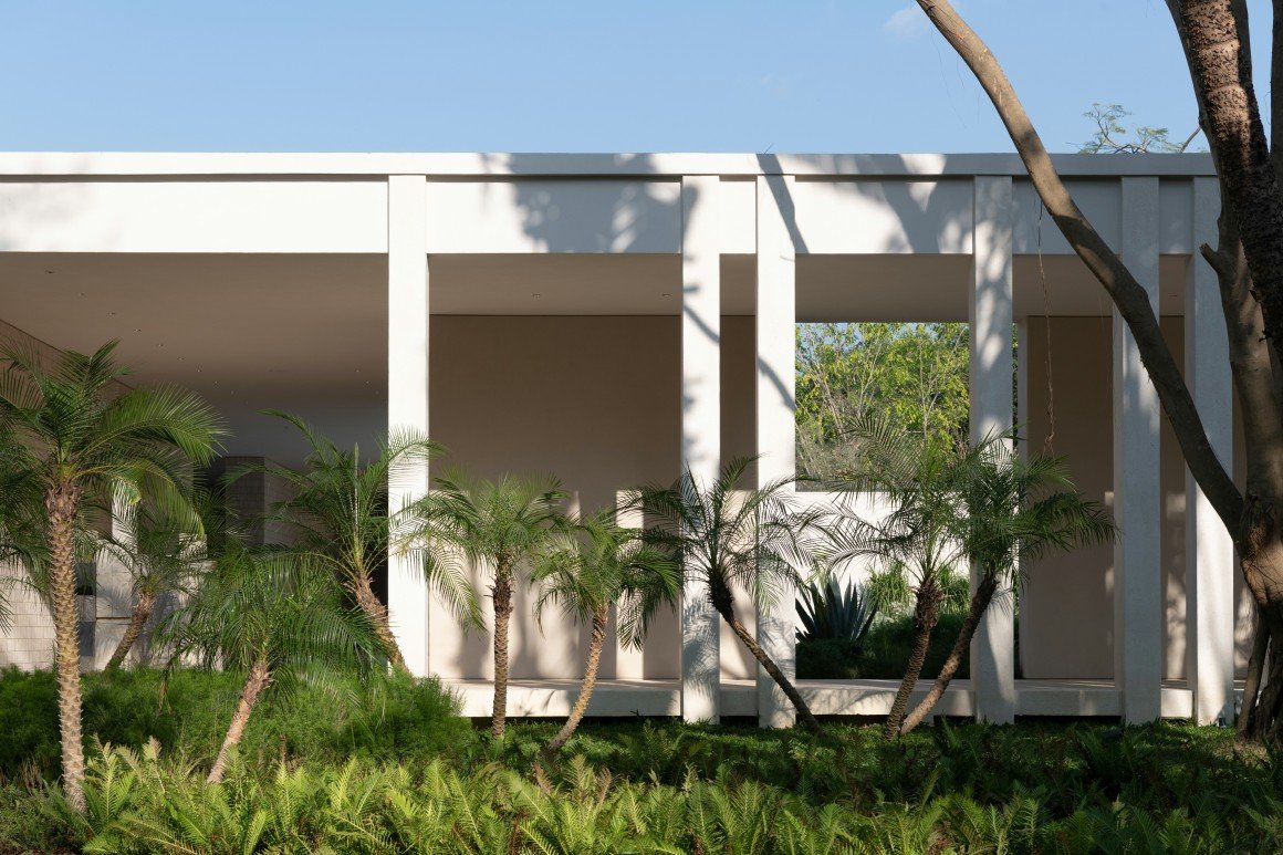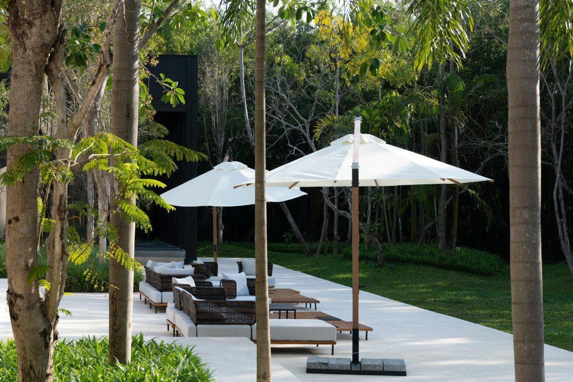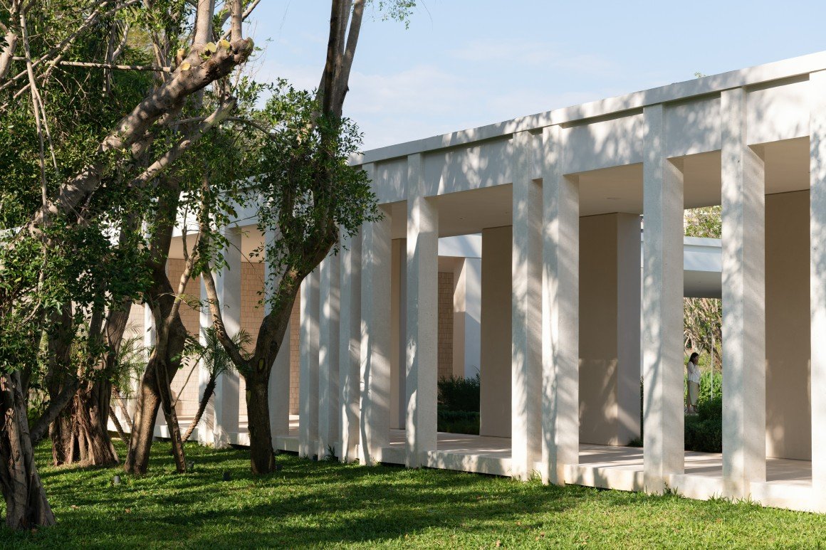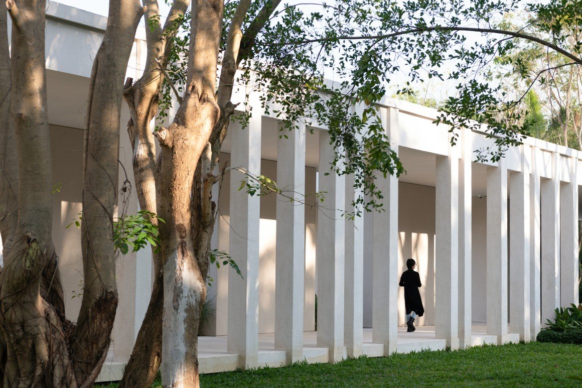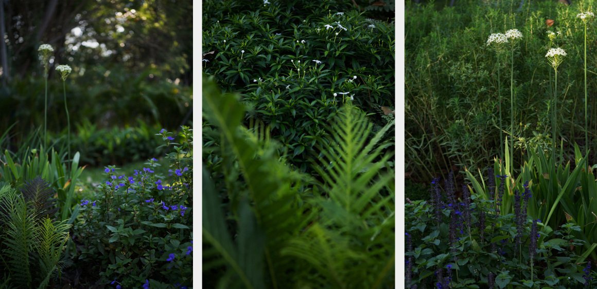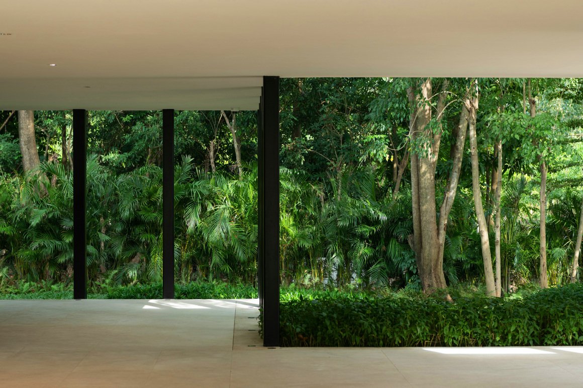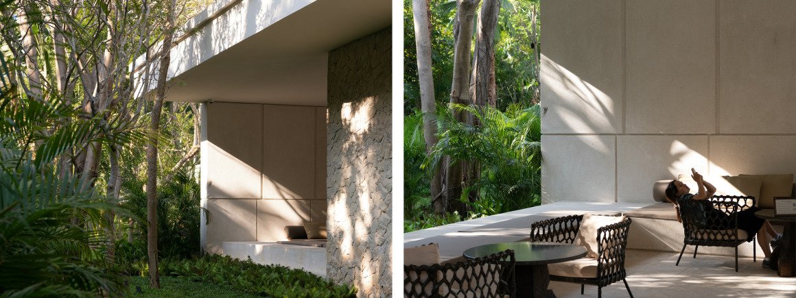 建筑南端延伸出一片铺装和草坪空间,用于户外休憩和活动。以密林为背景,两段平直的矮石墙巧妙地暗示和界定了花园边界,并与天光树影形成对话。其间,选择性保留的现状树,品种和姿态各异,成为林院空间的主体,突出野趣。细杆斜瓢的木棉、朴树、小叶榄仁等杂木林下,是开放通透的缀花草地;而粗壮密闭的印度紫檀和大榕树林下,则是起伏错落的散尾葵、雪茄竹芋等林荫灌丛。