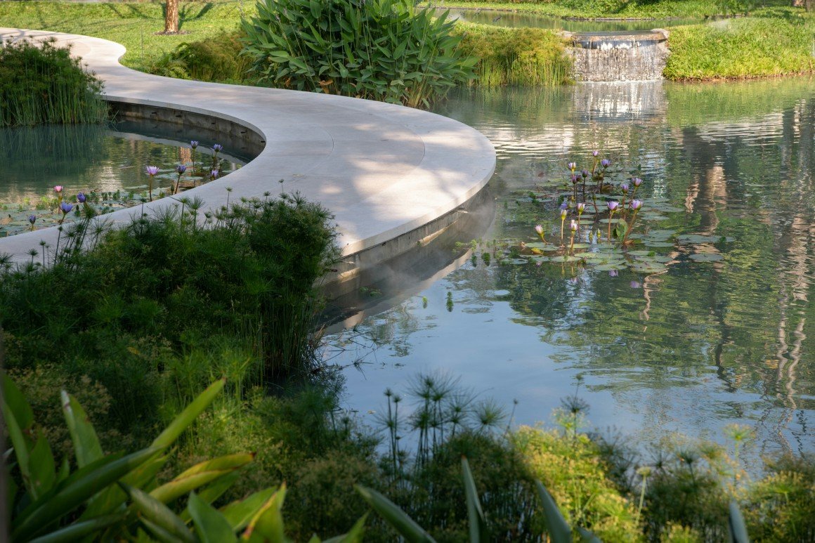“半亩方塘一鉴开,天光云影共徘徊”,在水花园中,水面如镜,倒映着天空、建筑轮廓与葱郁植被,虚实交织自然生动。结合建筑入口,景观空间呈现满盈与空灵的对比:白色小径蜿蜒穿行于湖面,如一条丝带轻拂水面,在绿意环绕中回归自然的怀抱;保留的狐尾椰、王棕等棕榈科植物丛林,以满盈的绿意充分展现热带风情,让人流连蒲葵上闪烁的阳光,也沉醉于湖面悬挂的桔红夕阳。