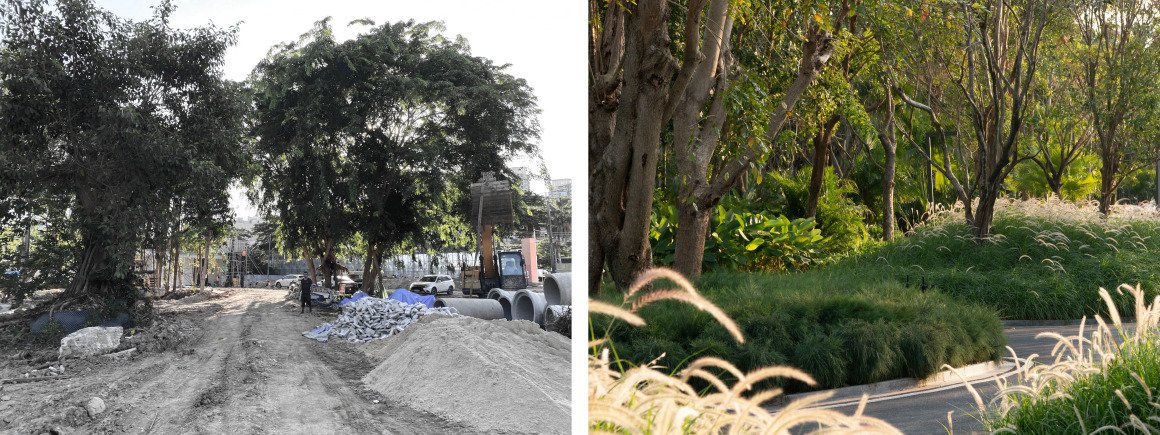 The site is relatively flat, but there is a 3-meter elevation difference between the municipal road and the site, with protective railings enclosing the boundary. The original site had been abandoned for years, littered with garbage and rarely visited by people, allowing plants and birds to thrive freely. A polluted water channel was hidden within the jungle, and the site contained municipal infrastructure such aspipelines and fiber optic cables. When the designers first encountered the site, it was akin to how the early inhabitants of Hainan Island faced a jungle teeming with flora, fauna, and water sources. The intervention of the landscape design was like the cultivation of terraced fields, drawing wisdom from traditional agricultural practices in water and soil utilization. It addressed complex site issues in a simple and direct manner, creating a cultivated field beside the habitats of plants and animals, harmoniously coexisting with neighboring elements and integrating into the original natural ecosystem.