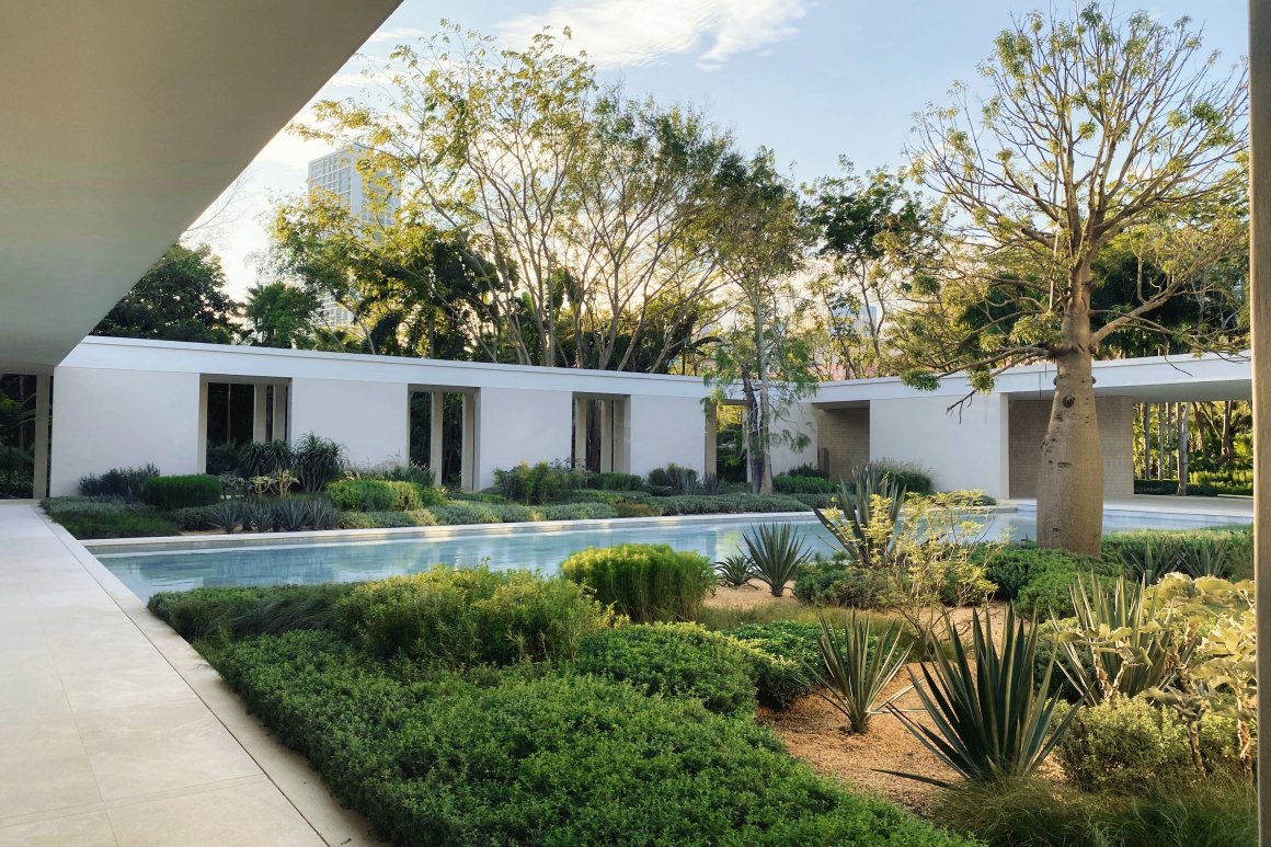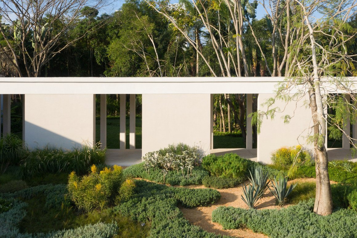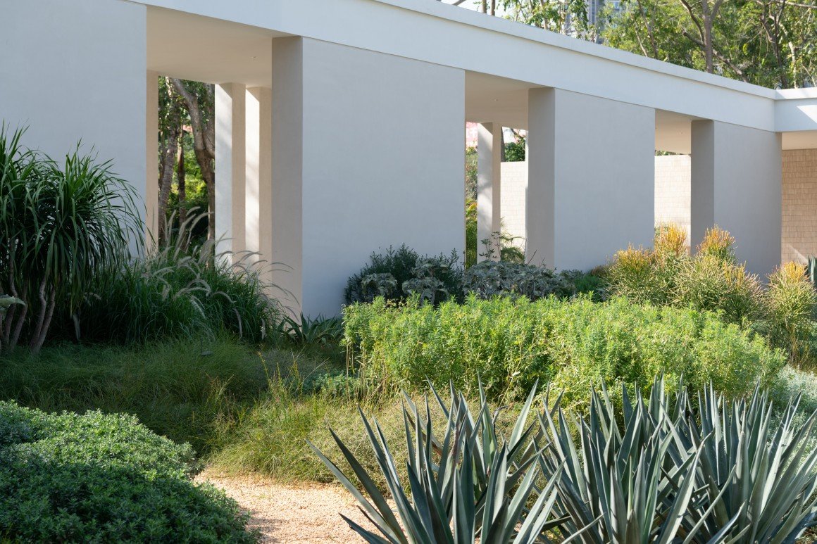 The design highlights the natural arrangement, forms, and textures of the existing vegetation, letting nature paint. Visitors experience a series of landscapes, including the “secluded green island, terraced garden, water garden, desert art garden, and lush tropical courtyards.” This achieves a transition from open public spaces facing the urban interface to courtyards.