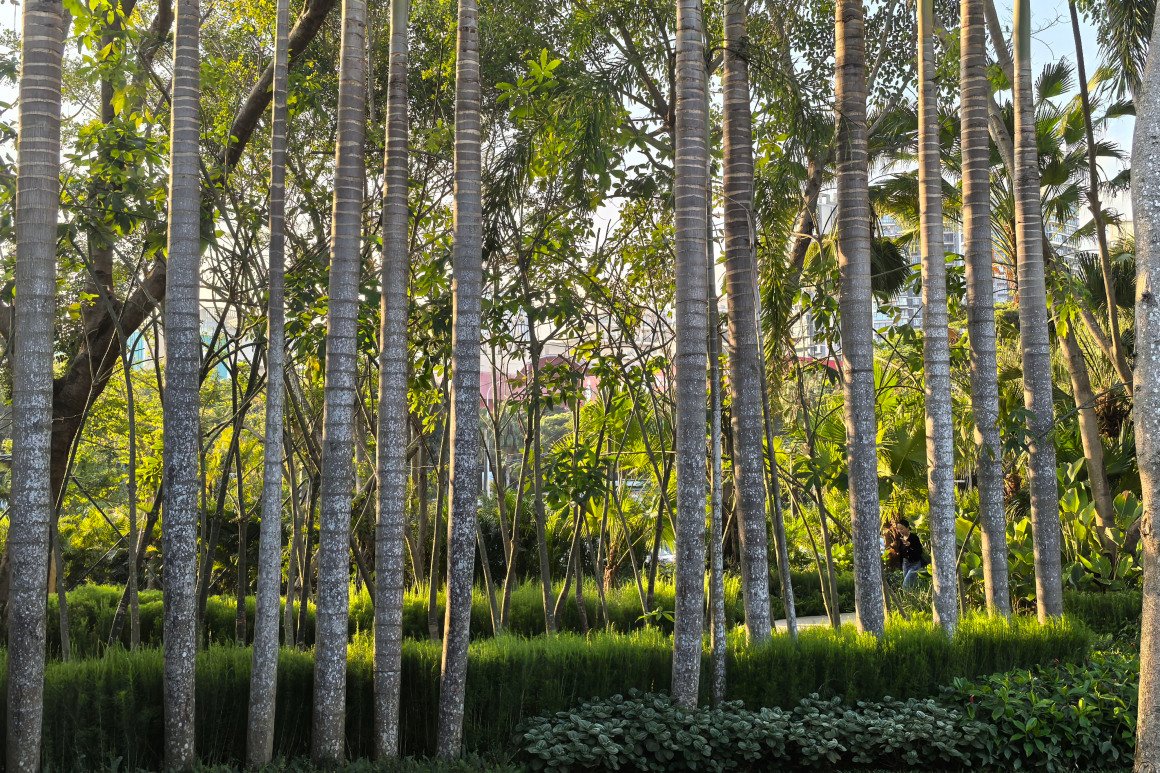 ▽保留发掘并突出展示了原状阵列狐尾椰树干的特色,并在林下补充配置了新的植物,老树新植并存造景 ©鲁冰