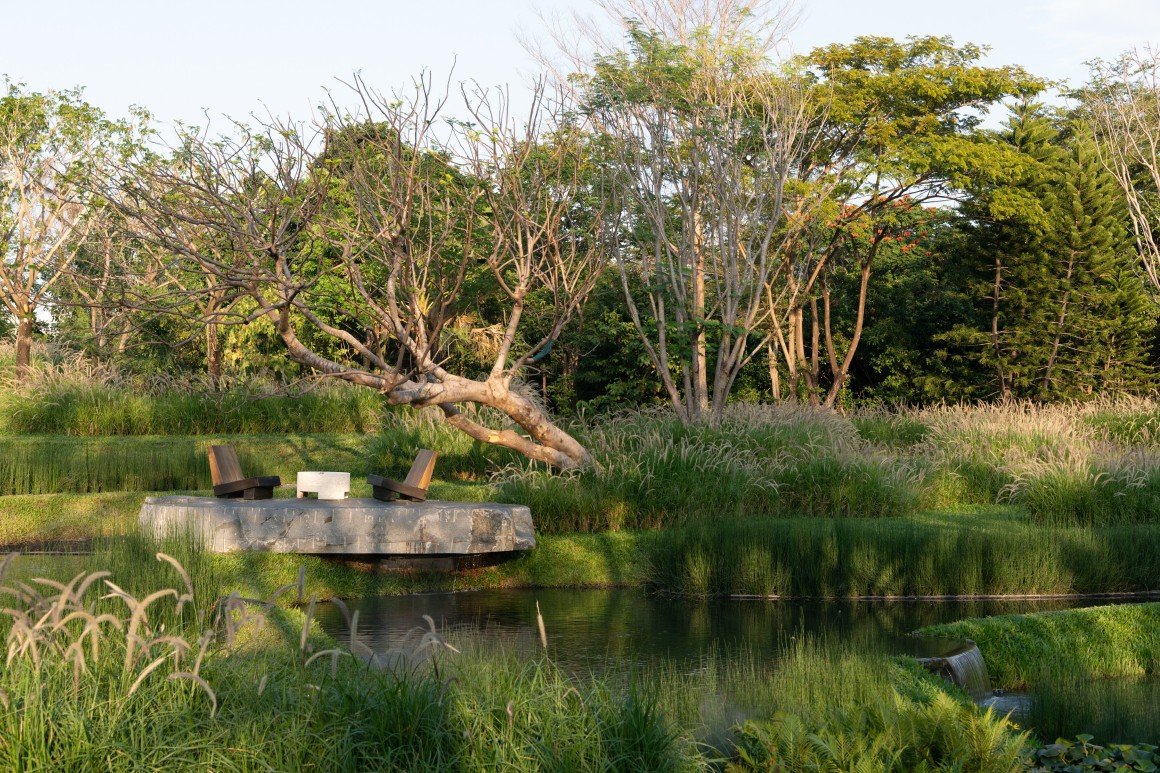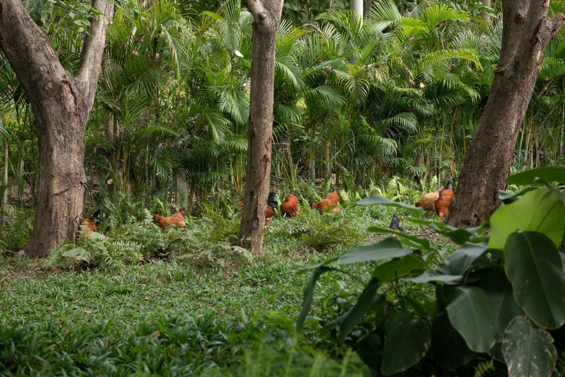 在三亚观岚花园,有梯田水影,白鹭翩飞;有林间小径,老树与新植共存相生;有林缘灌丛,家禽散养田园牧歌。这座隐于都市的花园,犹如书页折角引人翻阅,是致舍在热带城市人居环境设计中探索地域特色表达的一次实践。该设计在整体上保留了热带地域丰富而粗犷的自然野性特征,同时通过在以农业生产性景观为载体的第二自然中汲取传统水土利用的智慧,用现代自然主义的设计手法在城市空间中进行景观艺术化的转译,是美学与自然生态过程的融合,展现了人与自然和谐共生的理想生活图景。作为农耕民族,千百年来中国人依附于土地,从农业开始开发利用土地,开垦农田建设村落,田园生活所特有的安宁、恬淡的气质,对动植物的生命观察、悉心照料与耐心耕耘的美德,都赋予空间独特的幸福体验:“结庐在人境,而无车马喧”,身处繁华都市,我们仍旧可以选择一种自然质朴、松弛自在而丰盈生活。