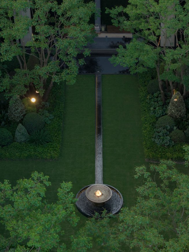 Geometric lines and tonal stone paving create a refined, orderly welcome. A shaded ceremonial axis leads to a fountain with subtle reflections, exuding elegance. The main entrance integrates architecture and landscape, featuring a hotel-style roundabout with sculptural cascading water and dancing jets—elevating the ceremonial arrival experience.