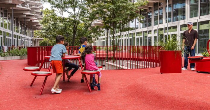 On Lion-Feuchtwanger-Strasse in Berlin-Kaulsdorf, a striking example of contemporary re-densification has taken shape within a typical large-scale housing estate from the GDR era. The architects at FAR frohn&rojas and the landscape architects at Topotek 1 have created an ensemble that reinterprets the principles of serial construction while focussing on lively, community-oriented outdoor spaces. Particular attention is paid to shared spaces: the central courtyard, open stairways and semi-public meeting zones encourage active neighbourly interaction. At the heart of it all is the “red stage”, designed as a place for exchange and encounter. The robust, modular and precisely colour-coordinated furniture from Vestre plays a defining role in shaping its character.