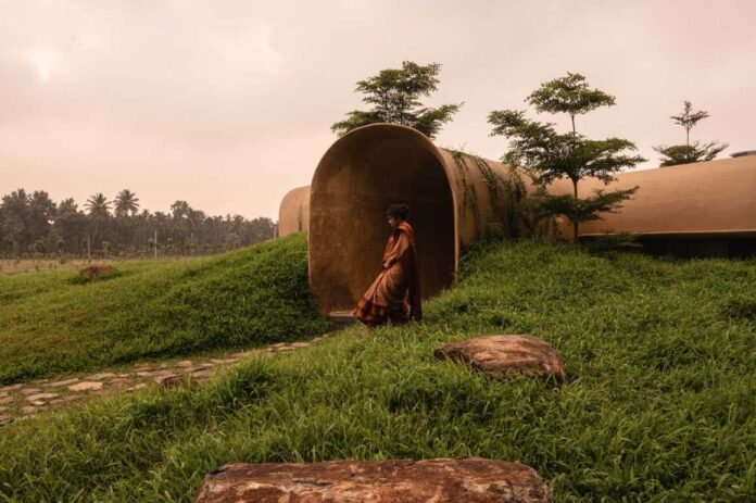 Being a self-sustaining structure, it has no columns or beams. Mud is not a material palette, the beautiful thing in earthen architecture is not only about using the materials, but also about the artisans. Traditional lime plasters from India flows along smoothly on the floor and the furnitures giving a luxuriant feel inside the spaces. This helps in reducing the temperature of about 3 degrees inside the space from the outside. 7½ft tall verdant landscape bends and hugs the structure with lush grown grass all around. Being the high humid area, this helps in reducing the temperature inside the spaces and also acts as a structural member for the structure.