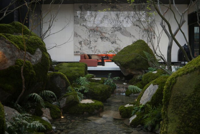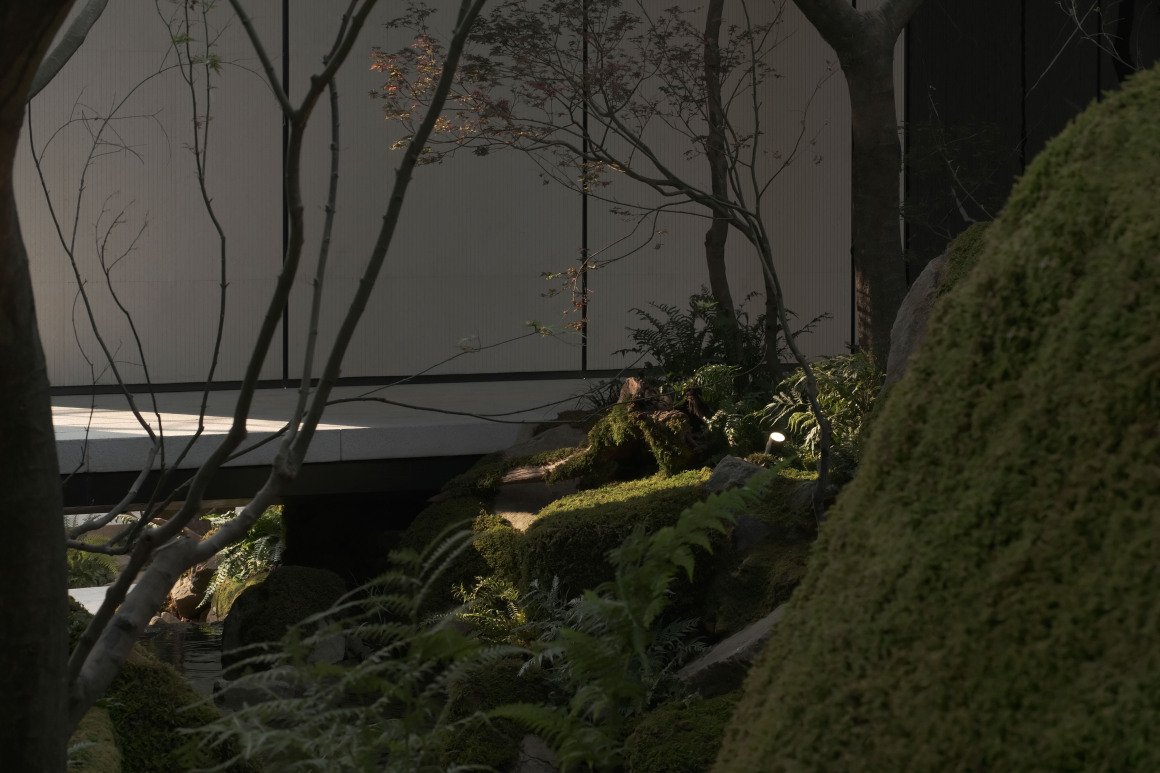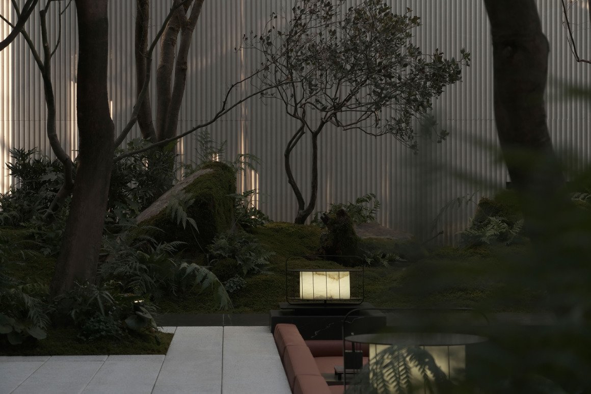 The main landscape of the demonstration area features a sunken courtyard of less than 800 square meters, surrounded by club facilities. The designer took an unconventional approach, dividing the compact courtyard into four smaller sections, linked by corridors, providing an immersive garden-like experience. Each courtyard is connected by refined corridors, preserving their individuality while establishing a cohesive spatial sequence both visually and experientially.