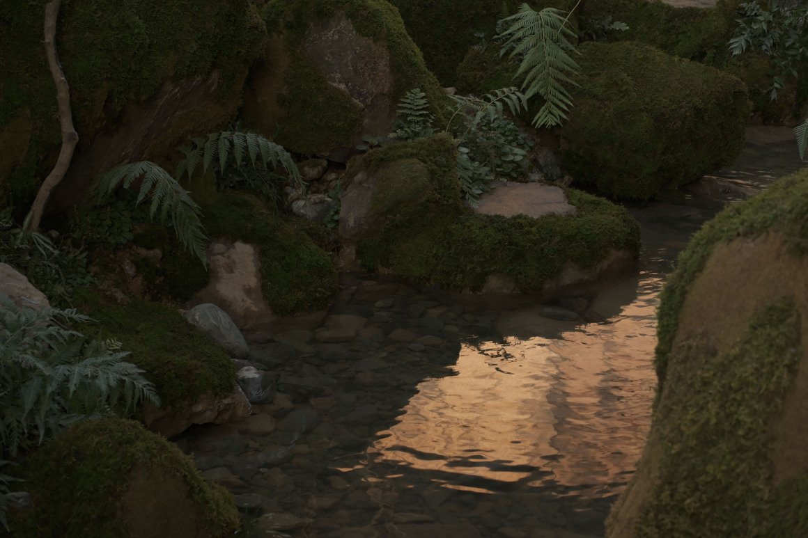 石材的布局与水景相结合,水流顺势而下,带来轻柔的流水声,清澈的水面与周围宁静的环境形成和谐的对话。水流在山林溪谷中缓缓流淌,创造了一种静谧、放松的氛围,同时增强了空间的自然感与灵动性。