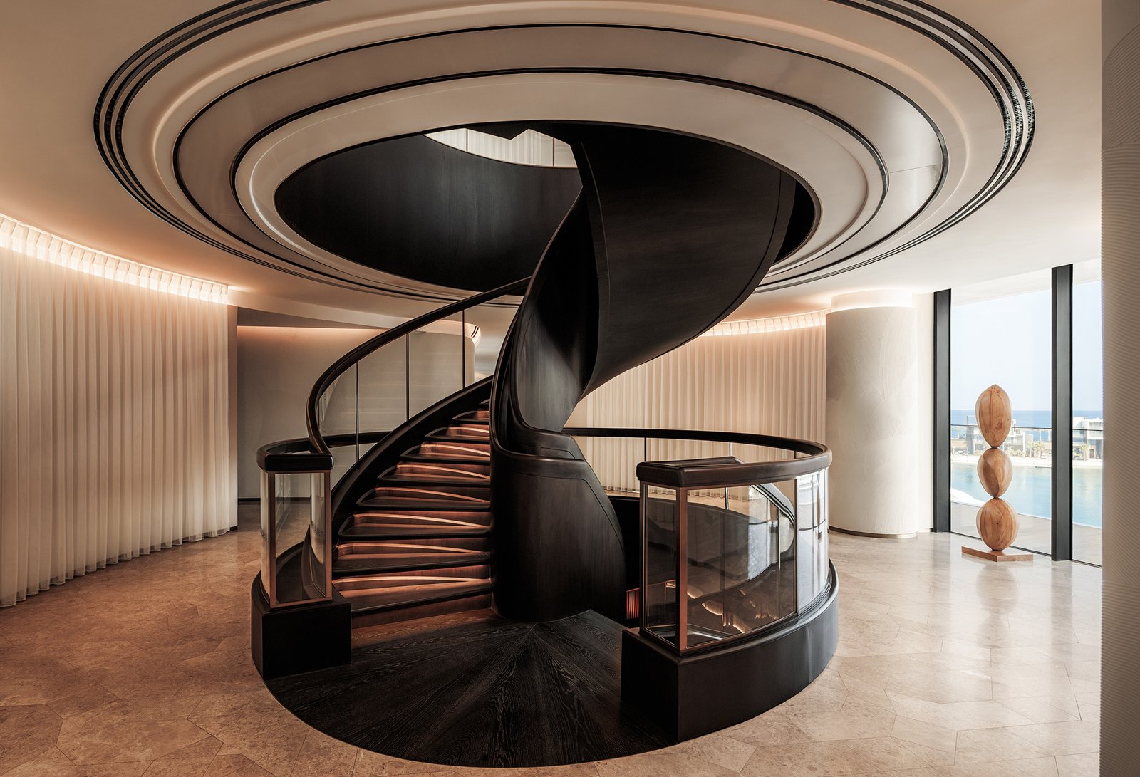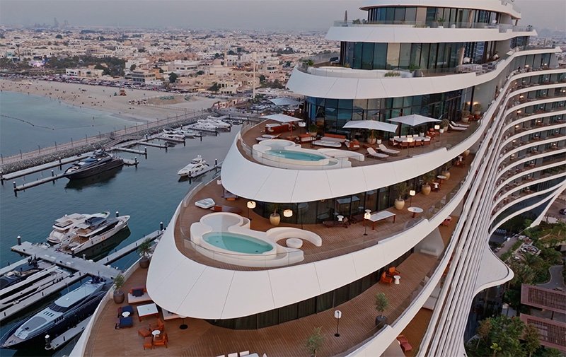 At grade level, off the neighboring roads, the hotel incorporates BOH services, undercover car parking, a marina, a private beach and luscious landscapes. In the upper ground level, the hotel includes the formal arrival experience, which leads to the drop-off for the hotel lobby and F&B outlets. The hotel features 12 levels of 387 sea-facing guest-rooms with wide balconies designed to provide the guests with a harmonious feeling of the interior spaces extending towards the exterior. The upper crown floors include four exclusive penthouses, each with an area of 650 m2. The combinations of simplex, duplex and triplex apartments include private pools on their vast balcony decks, providing the residents with ultimate privacy and uninterrupted views of Burj Al Arab, the Arabian Gulf, and Dubai’s new picturesque marina.