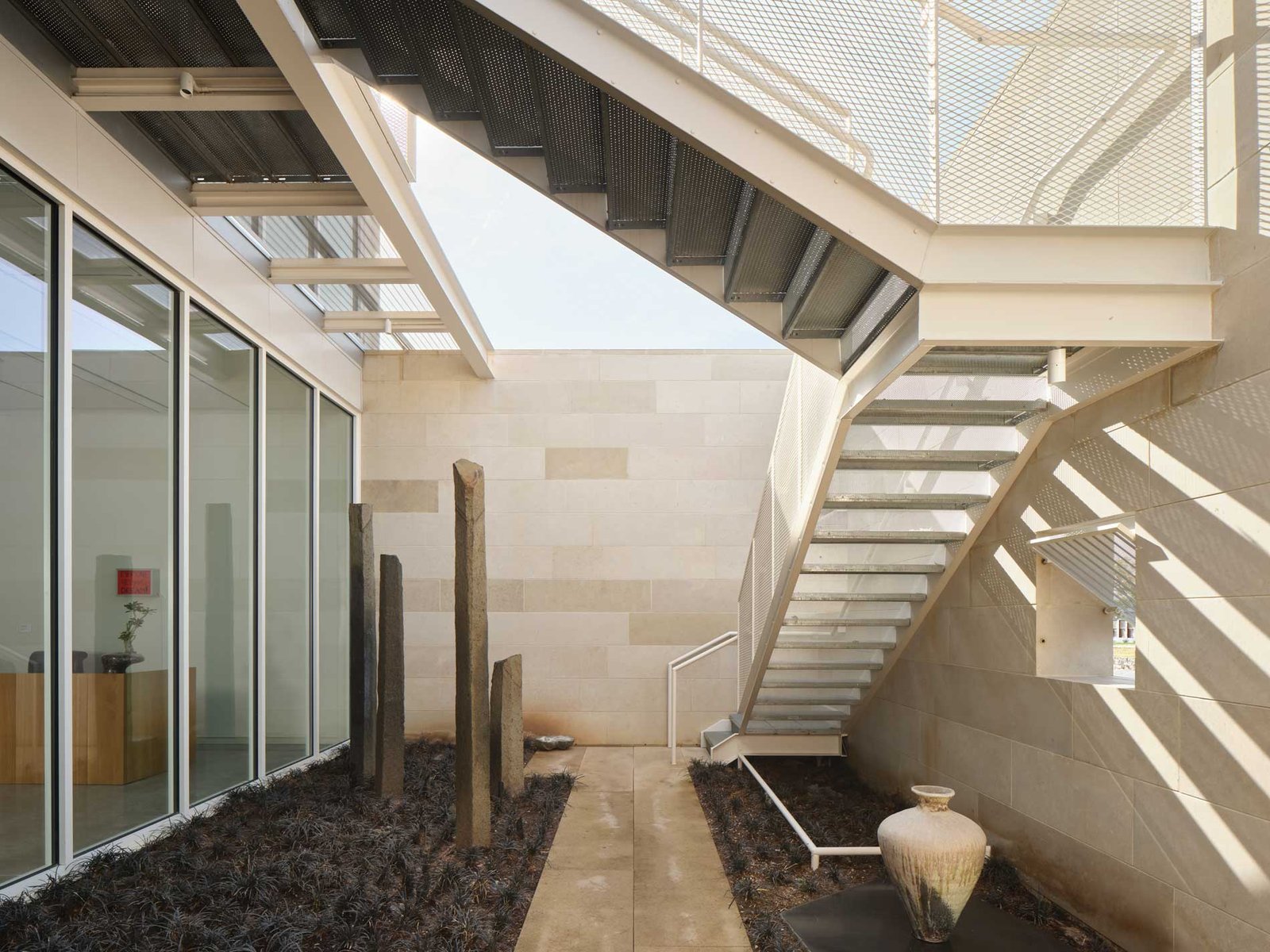 The new cultural anchor rises two-stories: Exhibition spaces are on the ground floor, and private offices are upstairs. The second story is stepped back from the property line and shaded by an overhang.