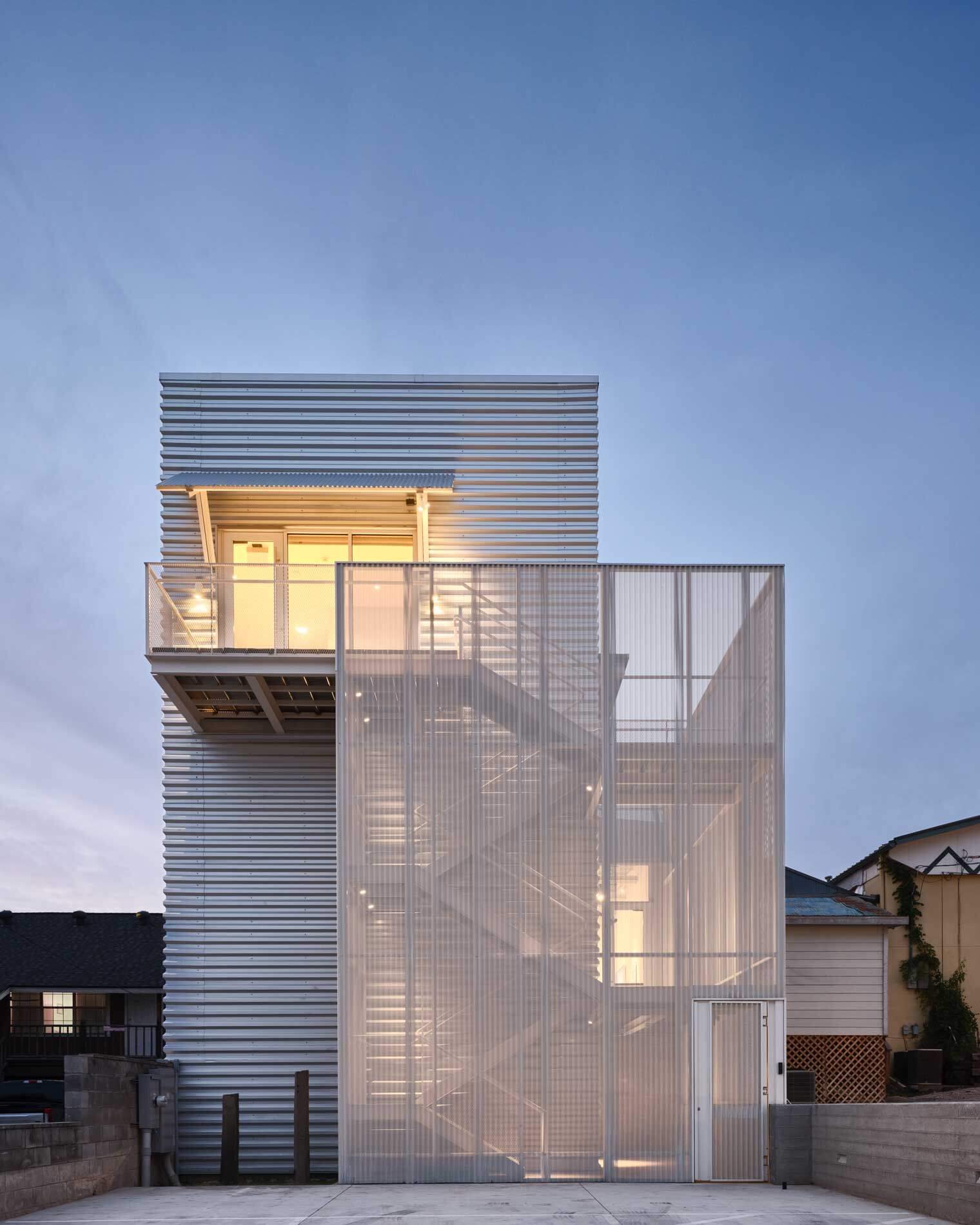 The rear facade is clad in corrugated metal siding. (Andrea Calo)