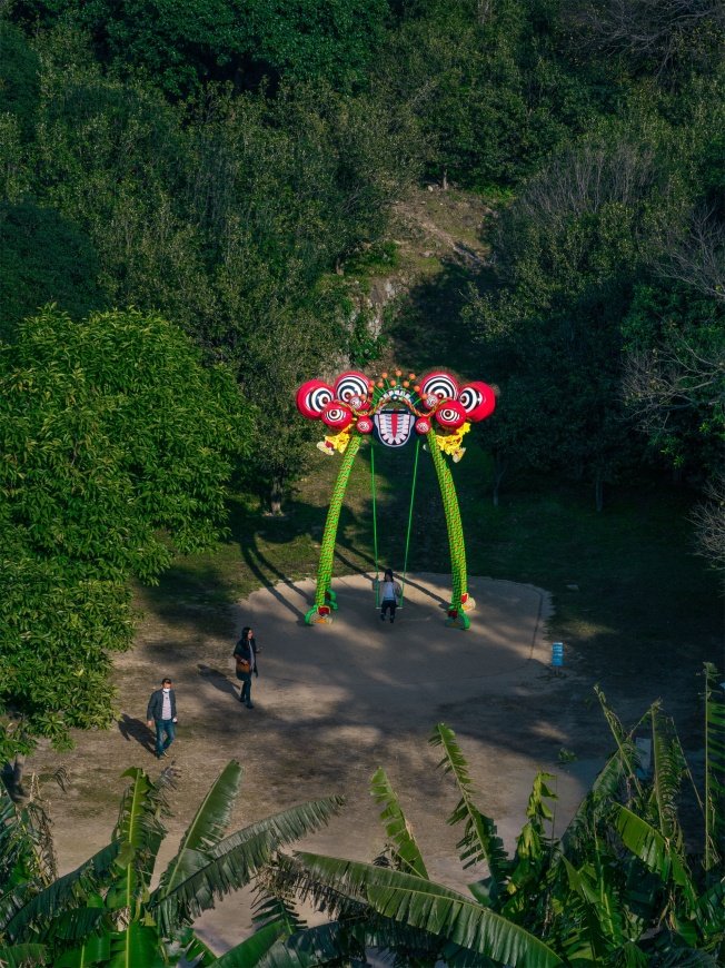 An installation with an actual swing, deconstructs and rearranges the traditional Lion Dance, playfully referencing auspicious Chinese idioms. The eyes as the main element of the piece have different shapes, referring to the different characters of the dancing lion. The lions jolly mouth reveals is wide open and playful springs sway in the wind.