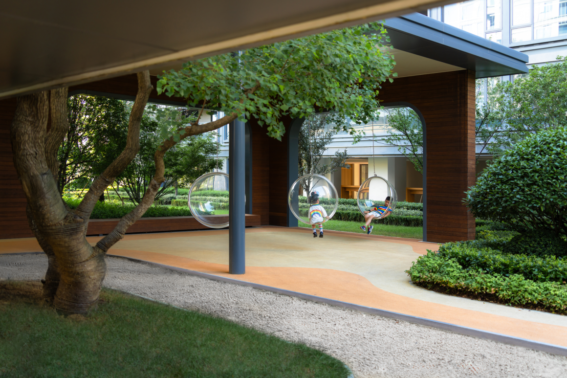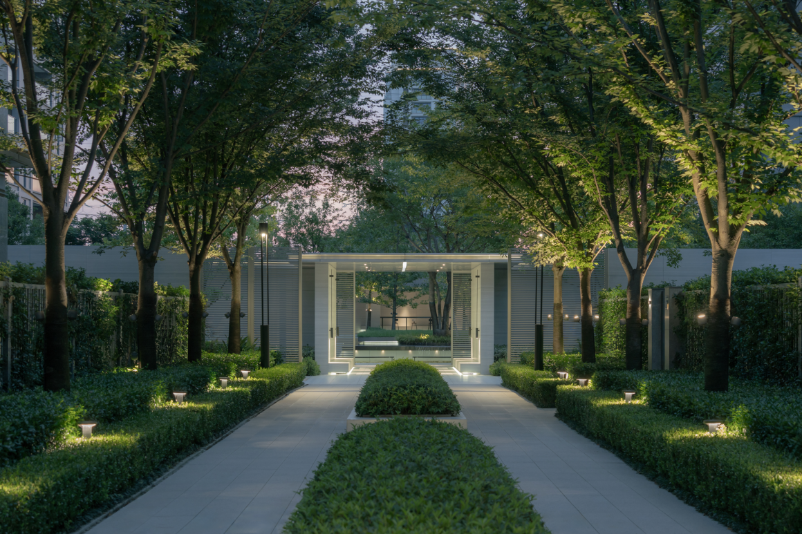 嘉兴桐乡是丰子恺先生的故乡,项目用地又与新建的丰子恺学校对望而立,我们觉得子恺先生的画作中透露出的平静而俏皮的神韵与我们想表达的项目气质十分接近,便以他的五幅作品为蓝本化为真实场景,分别为:繁花入院、童真探园、水落庭院、桐影游园、浮台望院,以对应他“曲高和众”的理念。