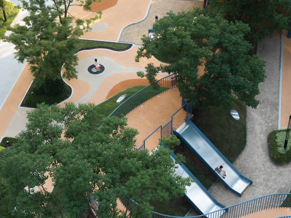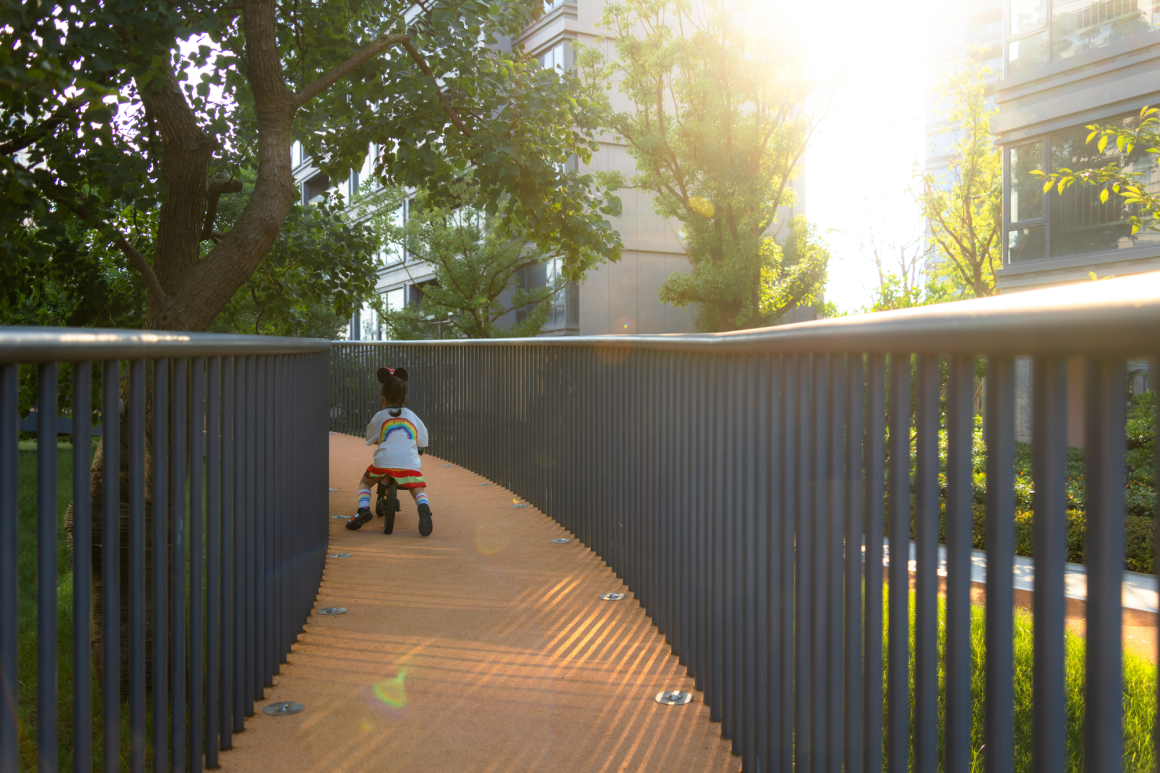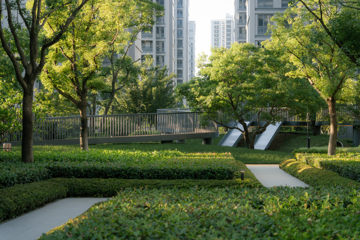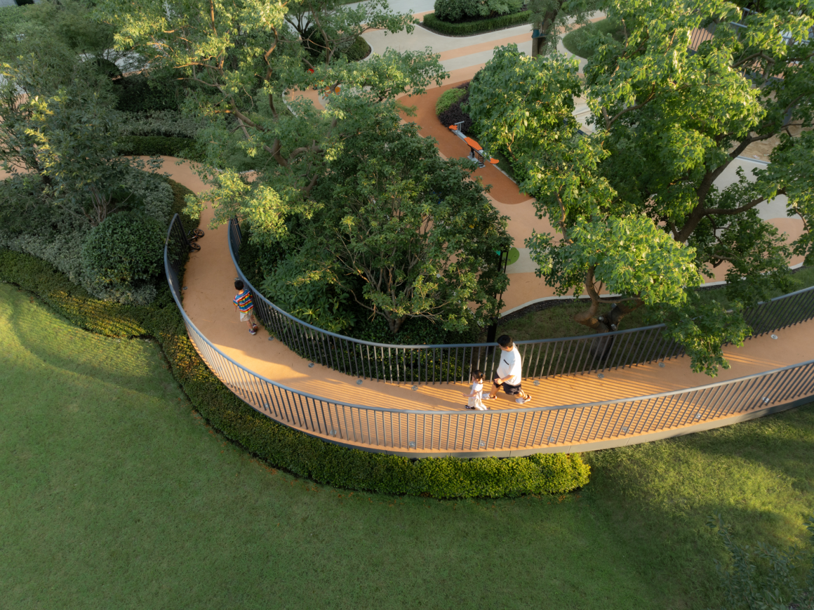 Interestingly, the site of our project is rightopposite the newly built Feng Zi-kai School in Tongxiang, Jiaxing, the hometownof Feng Zi-kai. We found that the calm and playful charm revealed in Mr. Zikai’s paintings was very close to the project concept we wanted to express, we have designed real scenes based on his five works, which are: Garden of flowers, Garden of innocence,Garden of waterfall , Garden of shadow, Garden of aerial platform, To correspond to his concept of “high and harmonious”.