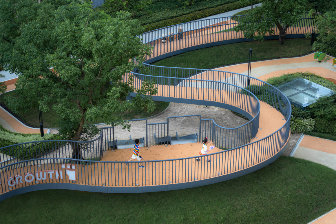 在活动场地的设计上,我们希望以孩子的视角来设计整个空间,二层廊架与栈道做了高度控制,是只供孩子上去的秘境,结合绿坡地形的变化让整个空间有点像游戏地图,多变、有趣且私密。