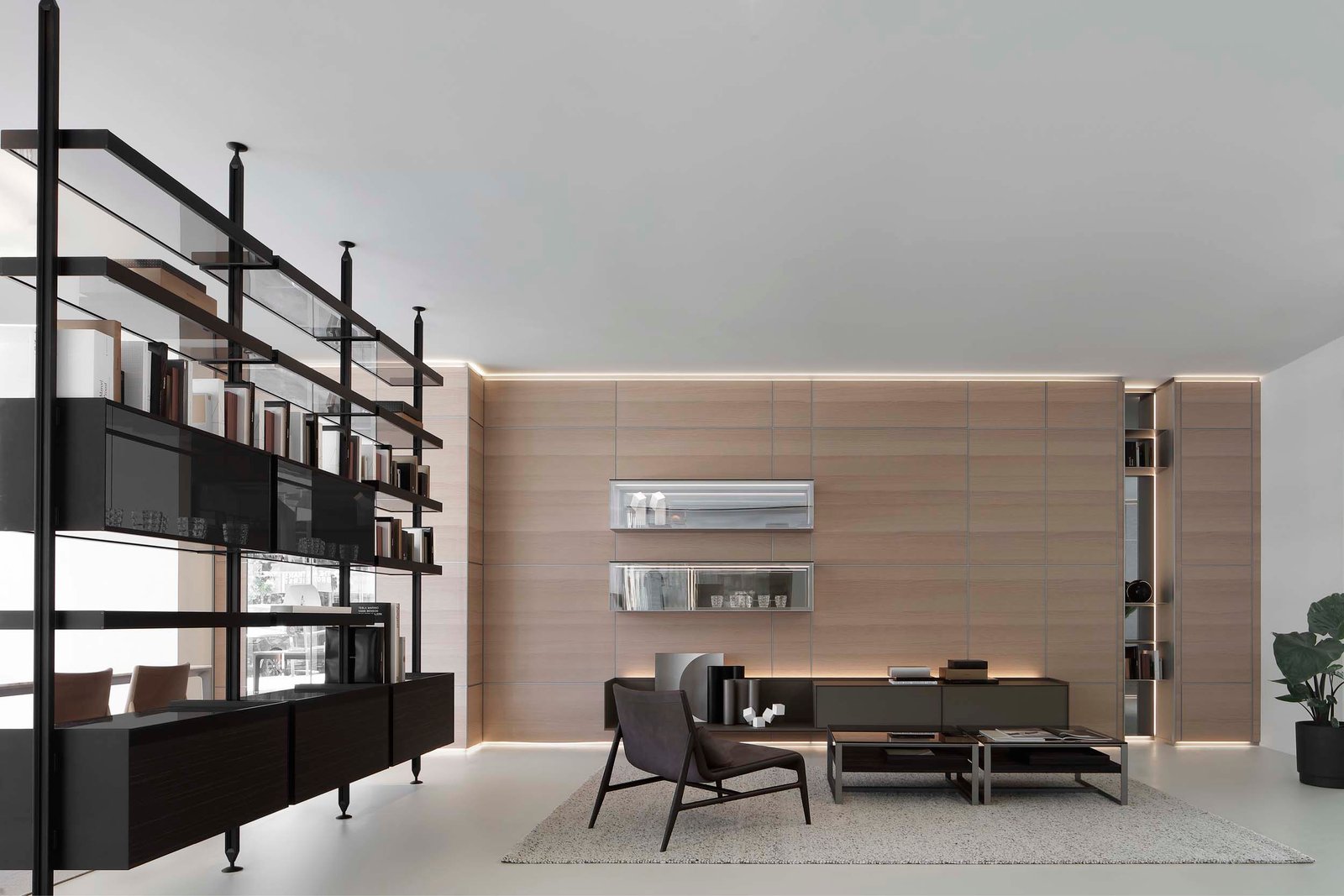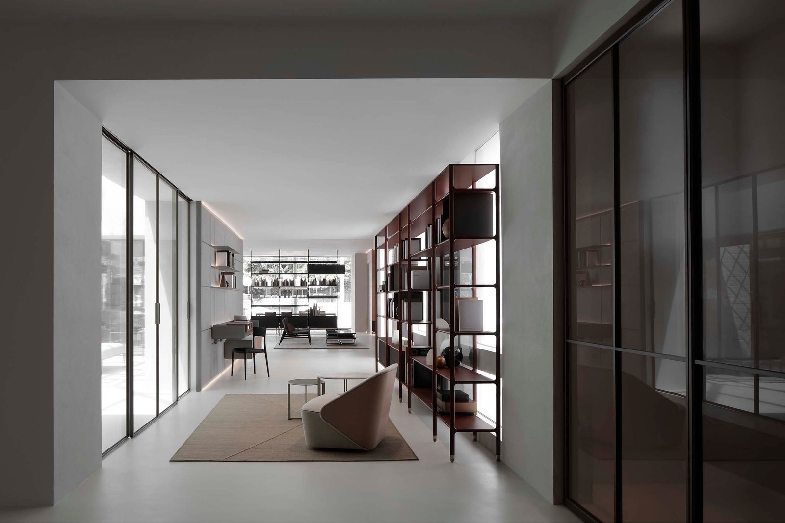 The space begins with a wall of windows, which bring natural light into the clean, white interior, warmed by the wall of Rimadesio’s boiserie. The neutral entry enables Rimadesio’s offerings to light the stage. The Long Island table falls to one side of a partitioning bookshelf, while on the other side a living room–esque set up offers seating and a console.