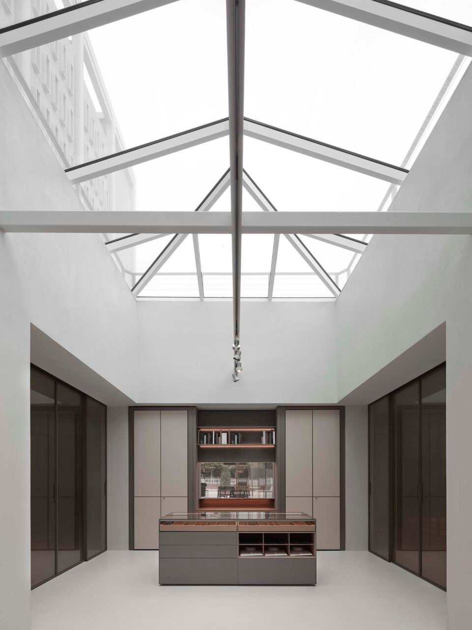 Like the design as a whole, the atrium balances lightness with the density and world building of the brand. The walls of the atrium are lined with recessed niches to display the brand’s closet and organization systems.