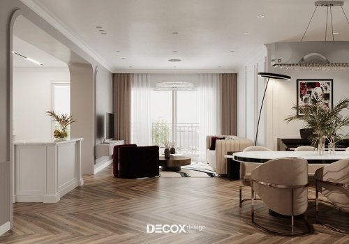 In this 130m2 Sunrise City project, Decox Design has chosen a semi-classical interior design – a harmonious and sophisticated combination of classical art and the functionality of modern spirit to create a luxurious and seductive overall, attracting all eyes. Throughout the spaces inside the apartment, neutral neutral tones play the main role, combined with noble colors and slender neo-classic lines. Besides, the light element is also cleverly utilized to complement decorative details to add “sublimation” and “shine”.