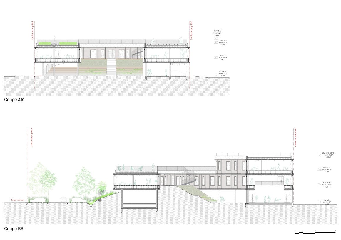 Les défis environnementaux sont devenus incontournables, d’autant plus dans un contexte de crise comme celle que nous traversons. Les vertus d’un projet durable notamment au travers d’une volonté forte et ambitieuse sur le plan des gestions énergétiques, et du bâtiment bioclimatique ne sont plus à démontrer. Aujourd’hui le réchauffement climatique est largement perceptible et les projets architecturaux doivent permettre d’en atténuer les effets dès la phase de la conception. L’excellence environnementale de ce projet s’appuie sur les leviers de la durabilité des matériaux utilisés, la notion de confort comme l’îlot de fraicheur et la sobriété énergétique. Nous avons donc choisi des matériaux bio-sourcés comme le bois, marqueur de cet engagement durable.