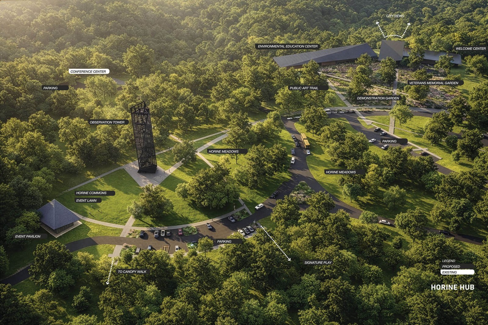 The Horine Pavilion designed by Olson Kundig will host events, leisure, and performance activities. This structure will be adjacent to a new Environmental Education Center, also by Olson Kundig. The structures are designed to echo the verdant surroundings and will be clad with “durable, natural materials.”