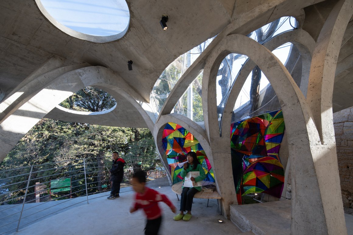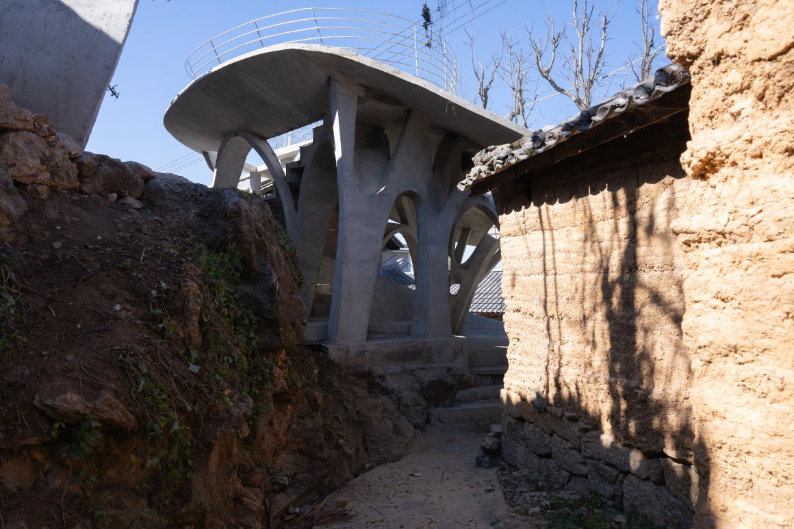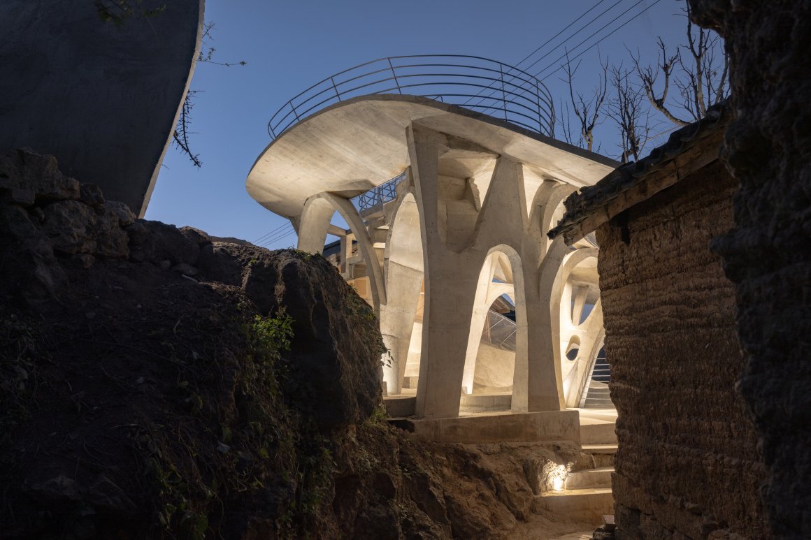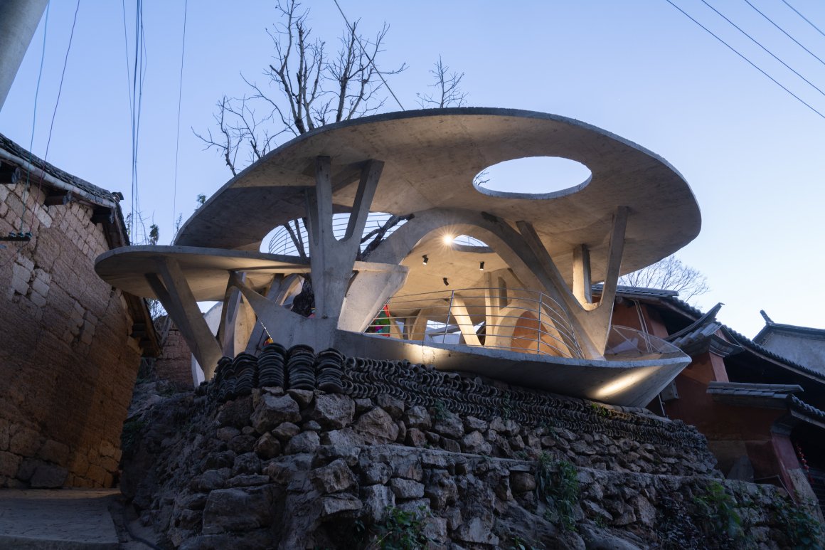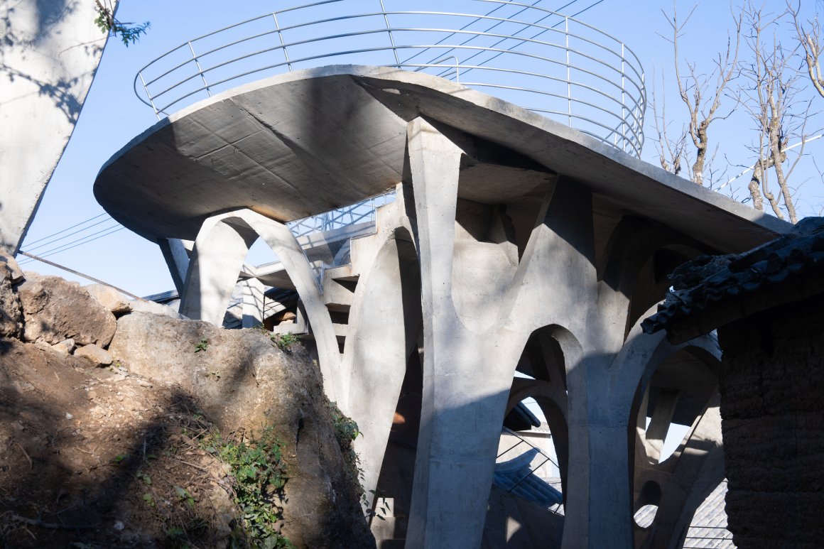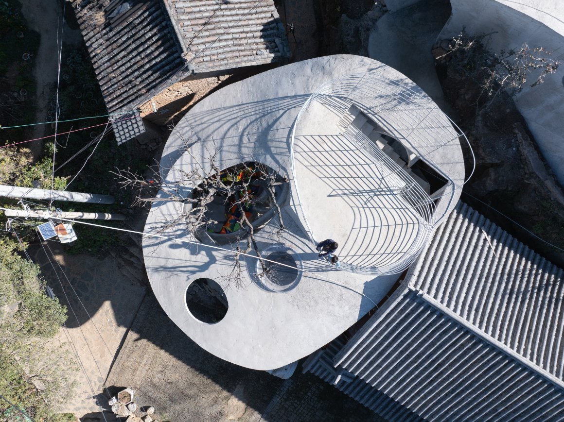 Under tight constraints of time, space, and preservation of the ancient tree, the design adopts an improvisational approach. Collaborating with local artisans, 12mm ribbed steel bars were woven into branch-like arches, cantilevering from the roof to form a dual canopy with the tree’s crown. Cast-in-place concrete vaults replace traditional “thatch-and-earth” materials, ensuring resilience while evoking primal shelter. The overlapping circular roofs, reminiscent of mushrooms native to the region, infuse playful symbolism into the structure.