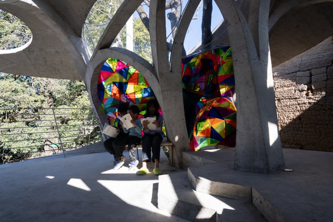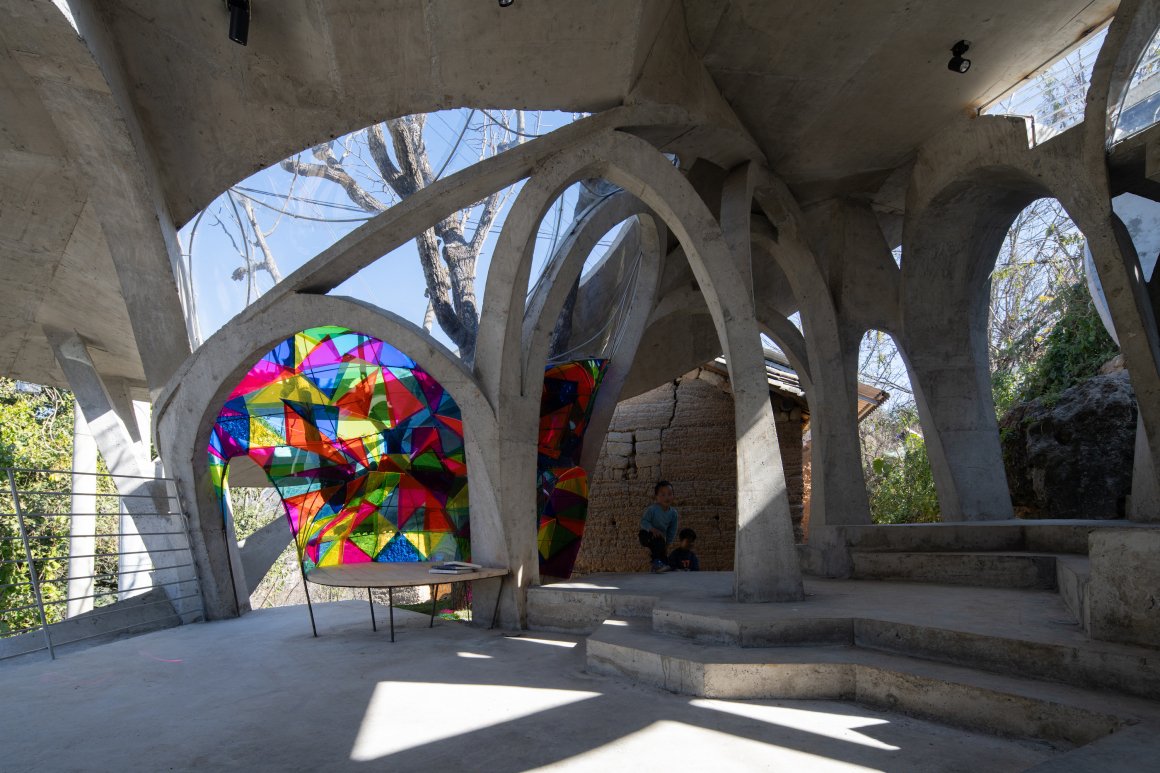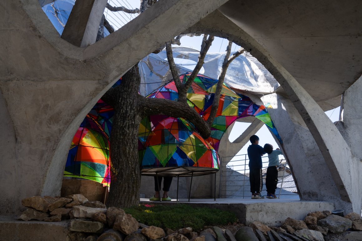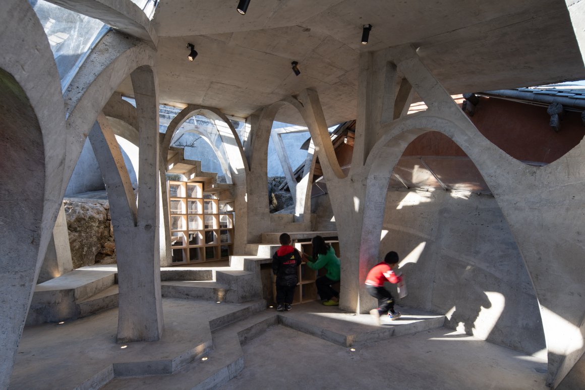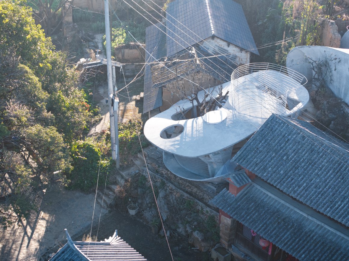 Under tight constraints of time, space, and preservation of the ancient tree, the design adopts an improvisational approach. Collaborating with local artisans, 12mm ribbed steel bars were woven into branch-like arches, cantilevering from the roof to form a dual canopy with the tree’s crown. Cast-in-place concrete vaults replace traditional “thatch-and-earth” materials, ensuring resilience while evoking primal shelter. The overlapping circular roofs, reminiscent of mushrooms native to the region, infuse playful symbolism into the structure.