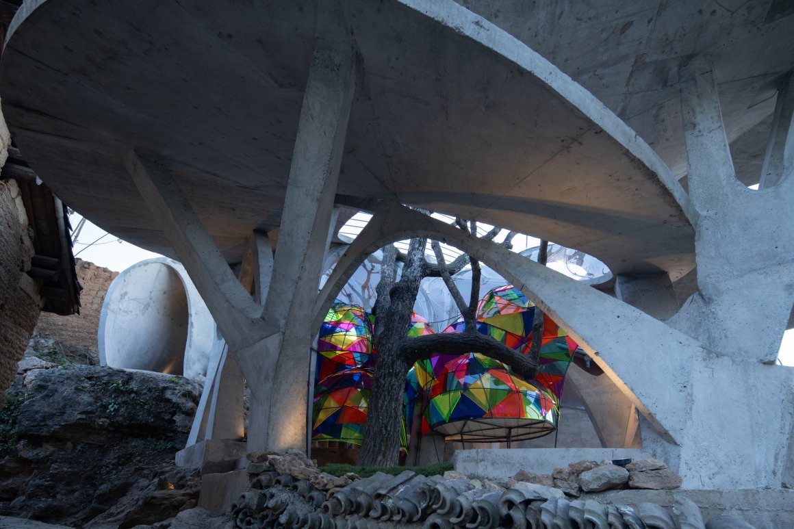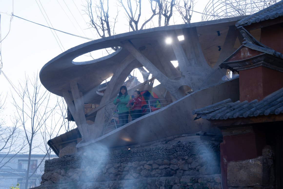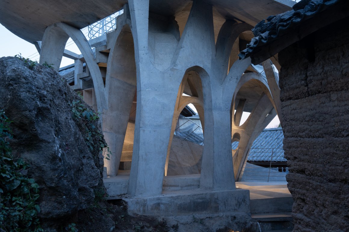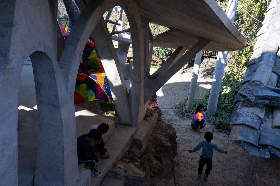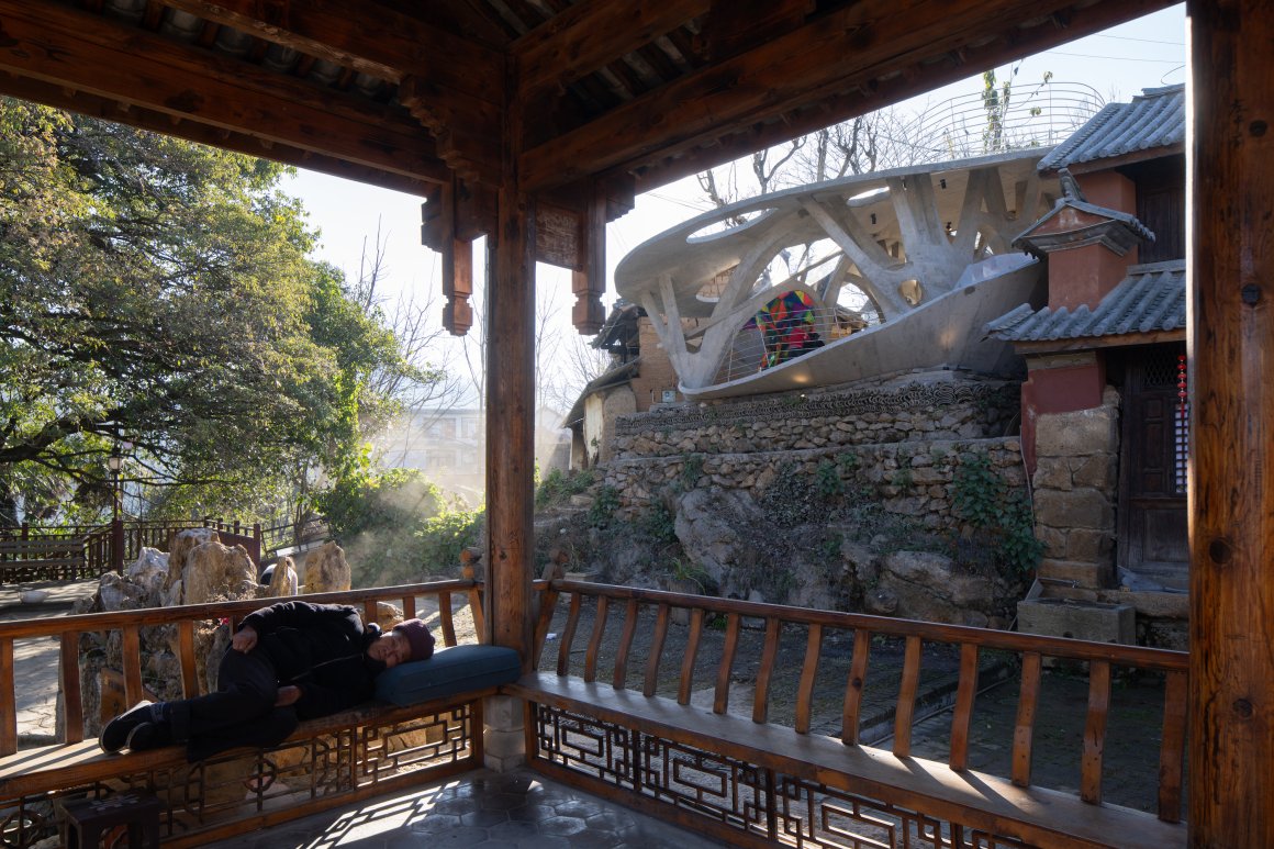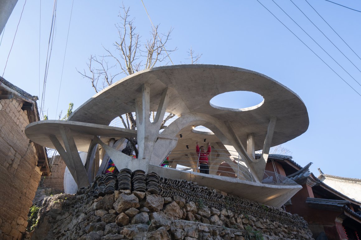 Under tight constraints of time, space, and preservation of the ancient tree, the design adopts an improvisational approach. Collaborating with local artisans, 12mm ribbed steel bars were woven into branch-like arches, cantilevering from the roof to form a dual canopy with the tree’s crown. Cast-in-place concrete vaults replace traditional “thatch-and-earth” materials, ensuring resilience while evoking primal shelter. The overlapping circular roofs, reminiscent of mushrooms native to the region, infuse playful symbolism into the structure.