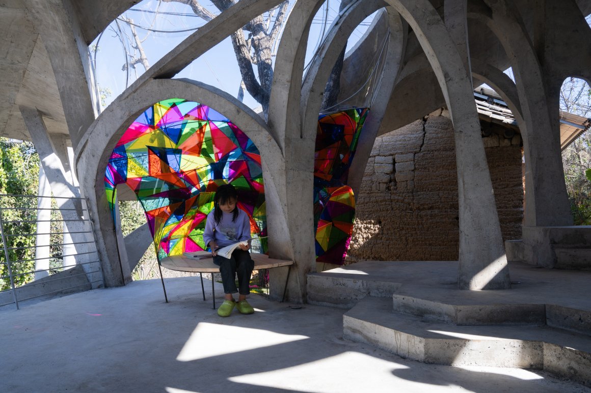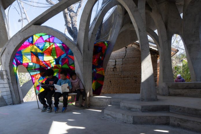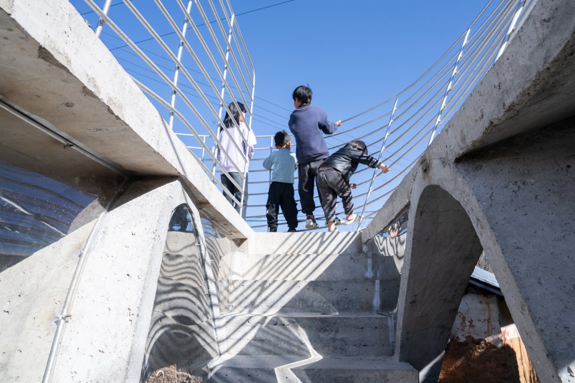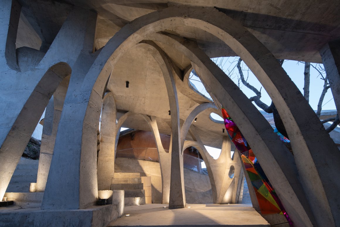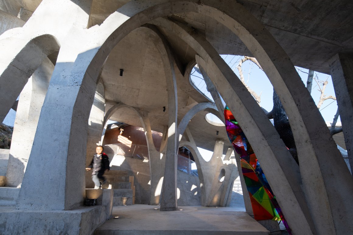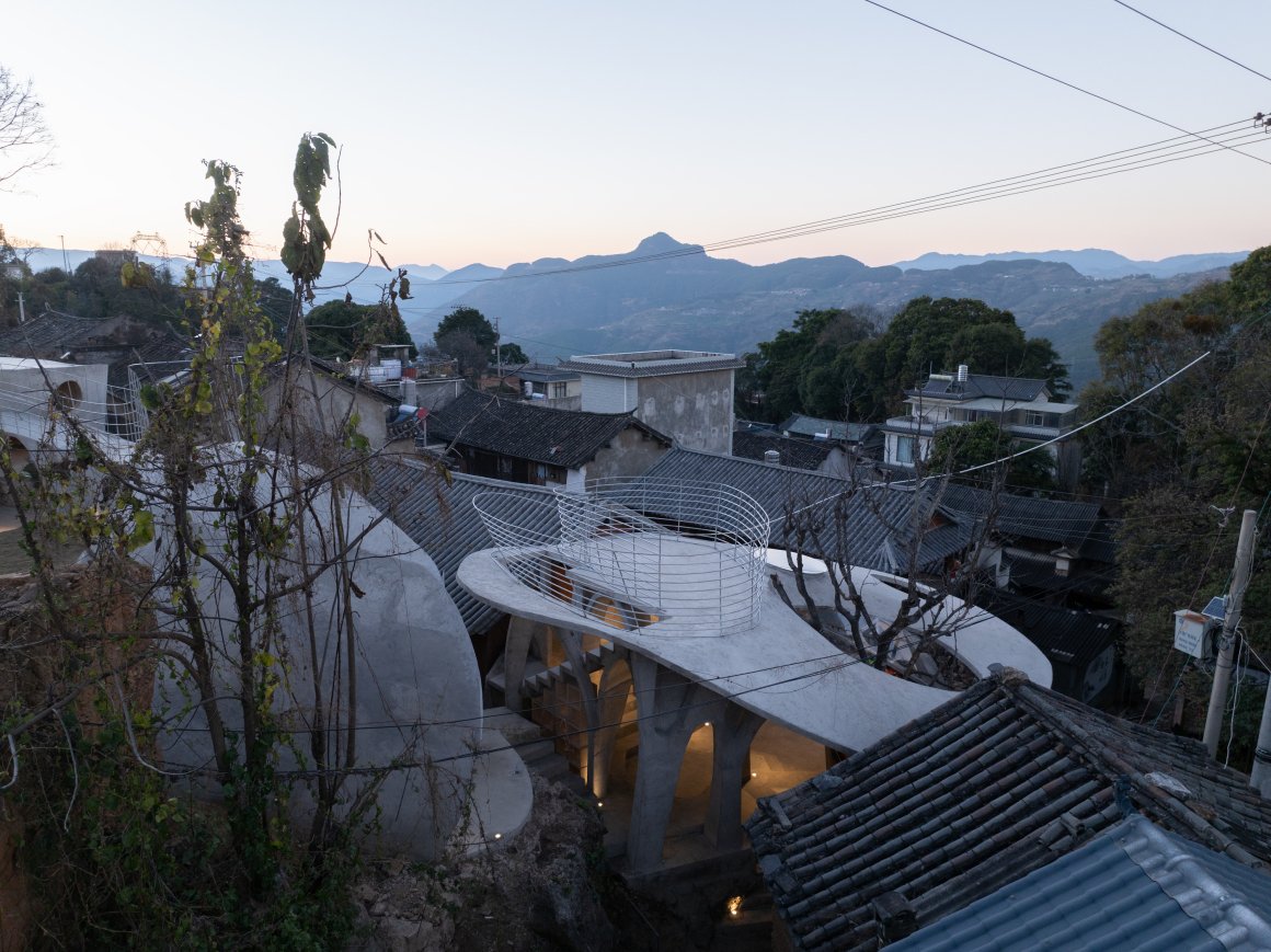 Under tight constraints of time, space, and preservation of the ancient tree, the design adopts an improvisational approach. Collaborating with local artisans, 12mm ribbed steel bars were woven into branch-like arches, cantilevering from the roof to form a dual canopy with the tree’s crown. Cast-in-place concrete vaults replace traditional “thatch-and-earth” materials, ensuring resilience while evoking primal shelter. The overlapping circular roofs, reminiscent of mushrooms native to the region, infuse playful symbolism into the structure.