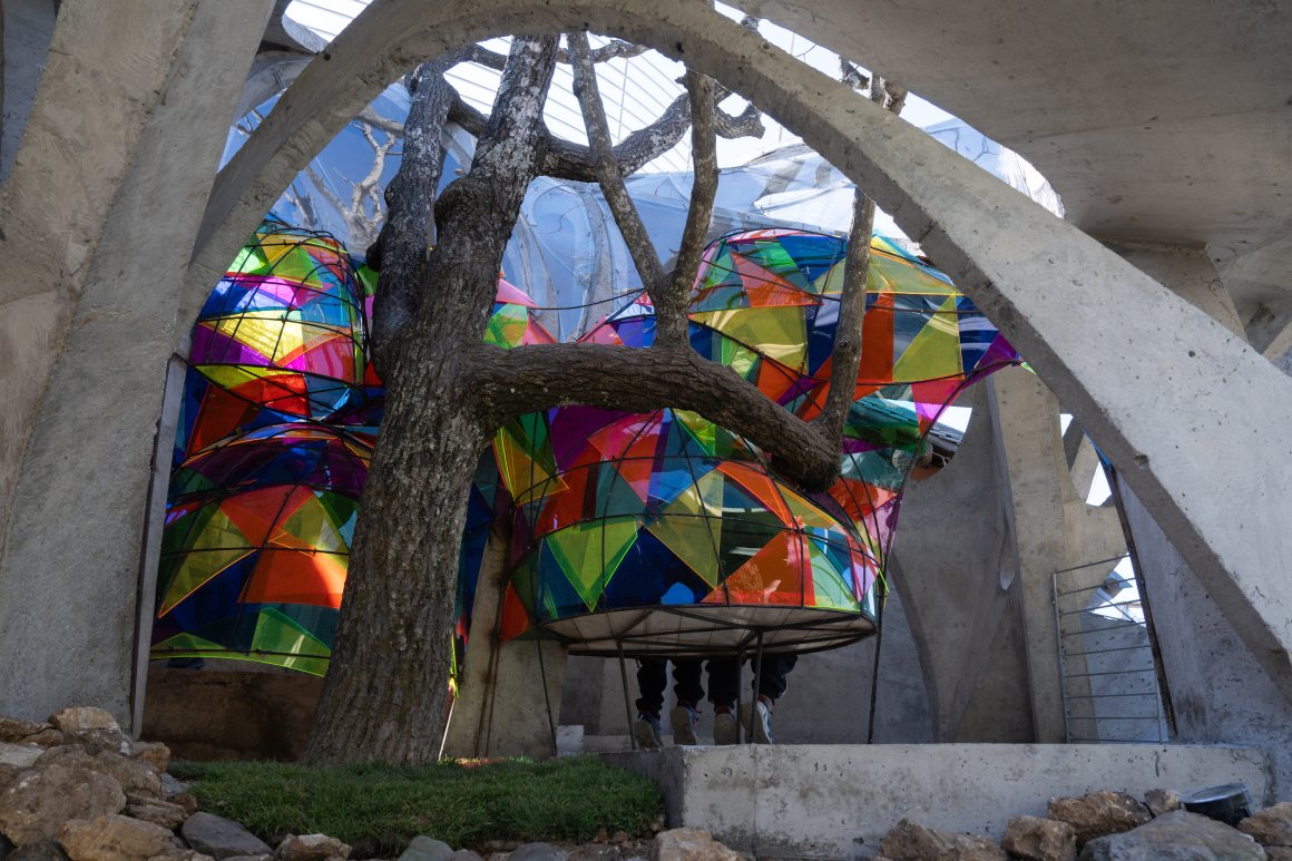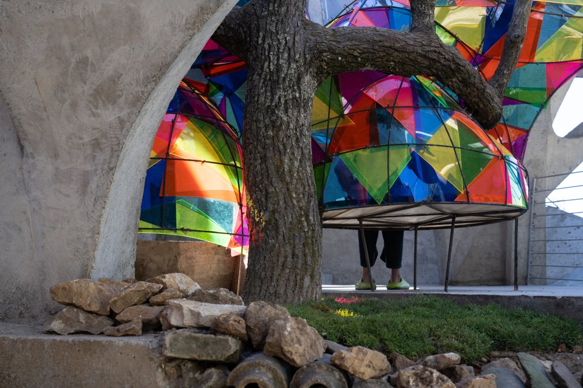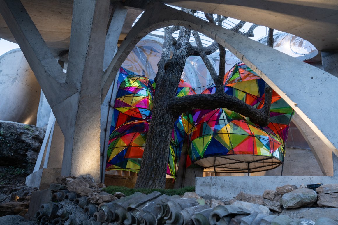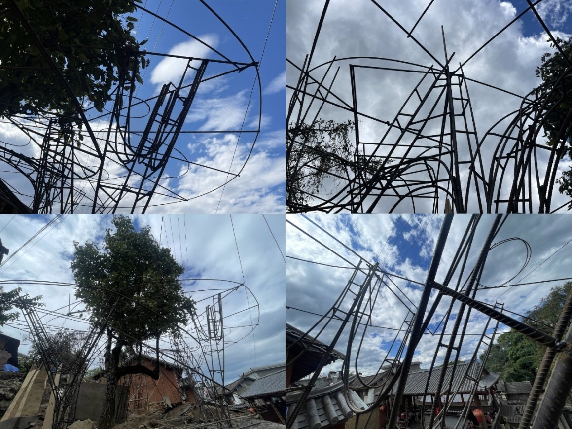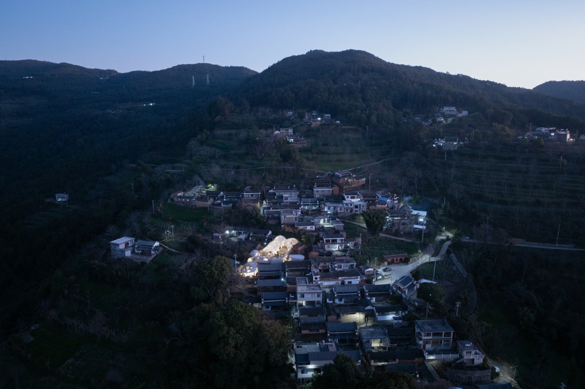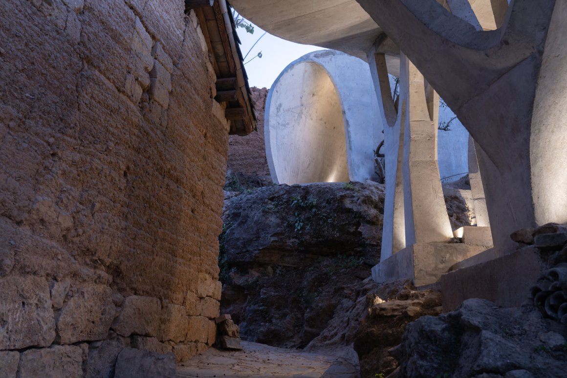 Under tight constraints of time, space, and preservation of the ancient tree, the design adopts an improvisational approach. Collaborating with local artisans, 12mm ribbed steel bars were woven into branch-like arches, cantilevering from the roof to form a dual canopy with the tree’s crown. Cast-in-place concrete vaults replace traditional “thatch-and-earth” materials, ensuring resilience while evoking primal shelter. The overlapping circular roofs, reminiscent of mushrooms native to the region, infuse playful symbolism into the structure.