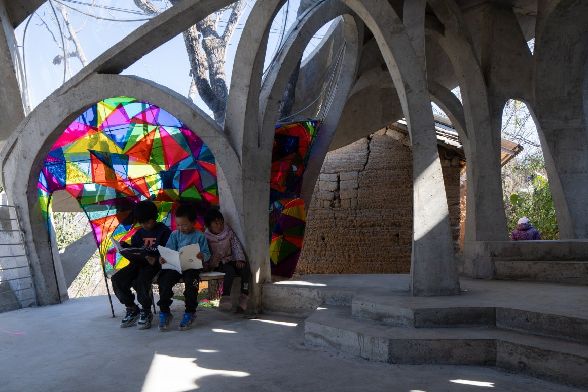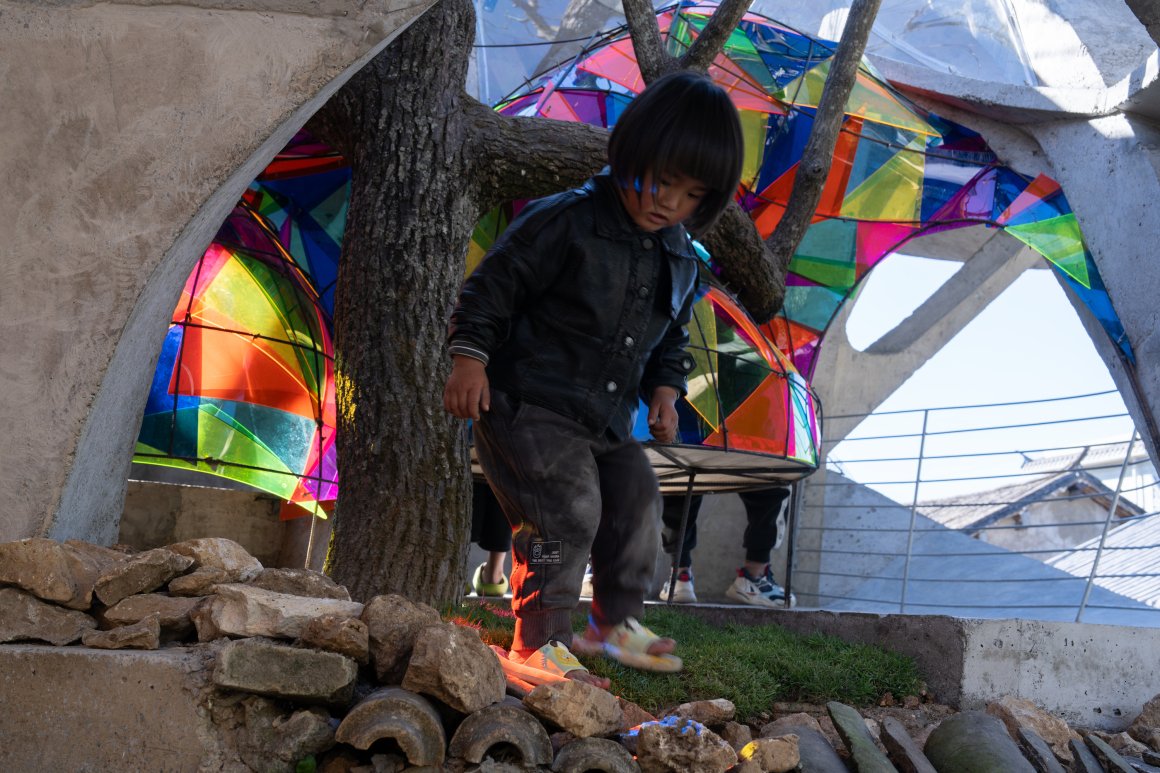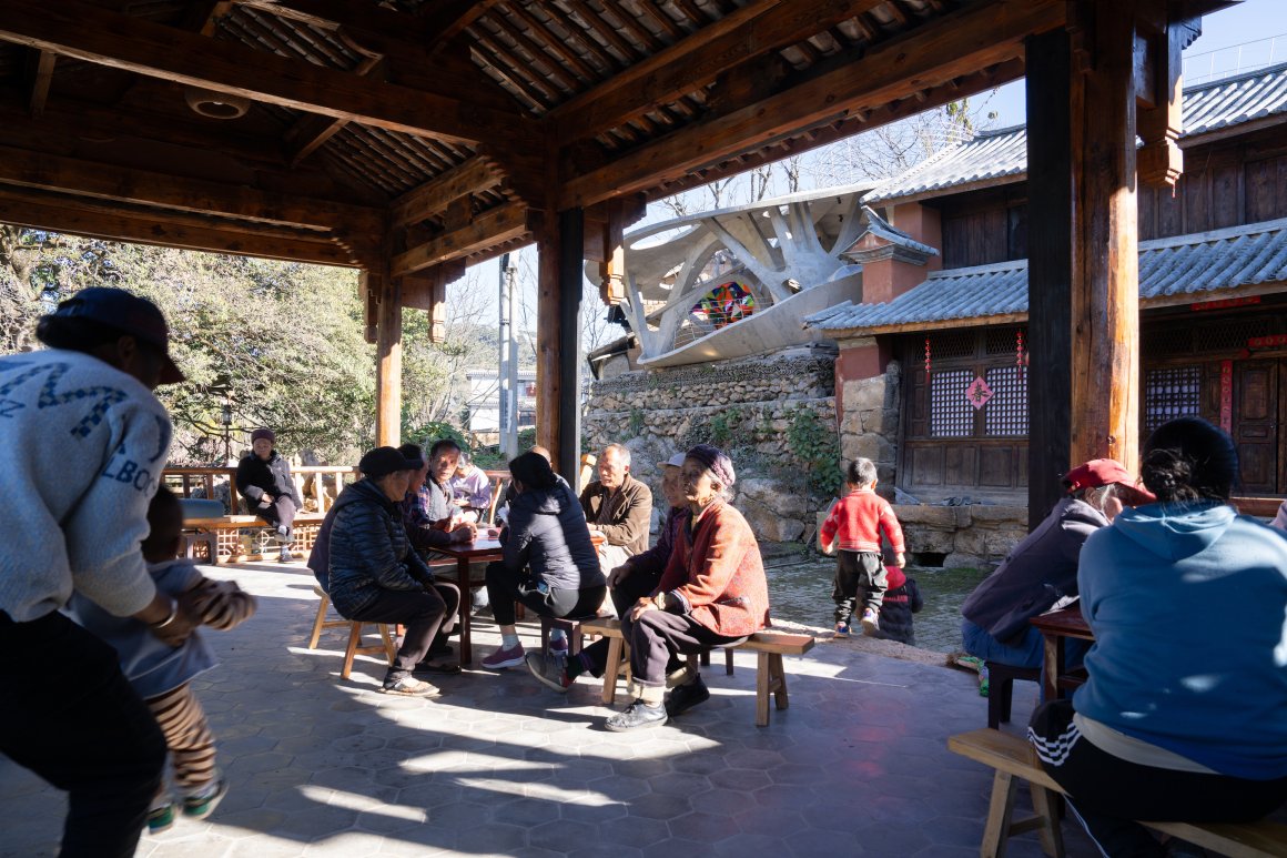 这个小小的书屋,日常场景被空间定格为动人的画面切片:薄雾笼罩的清晨,村子里93岁的杨大爷一如既往早起,在议事亭的长椅上等待清早的那缕阳光,孩子们已经在亭子晨读和玩耍;中午,议事亭里满是围坐打牌的老人,旁边小书屋里,孩子们的学习和玩耍的身影浮现;傍晚,放了六只黑山羊的杨大爷如约出现在书屋圆顶下的小巷子,每每周五,他都会在落日的余晖里把镇上上学的孙女接回家,在书屋里呆上一会儿,这成了她另一个学习和玩耍的场所。小书屋成为一个乡情充盈的时空胶囊,定格了跨代际的温情互动,容纳乡土记忆自由生长,也是未来记忆里的柴火星光。