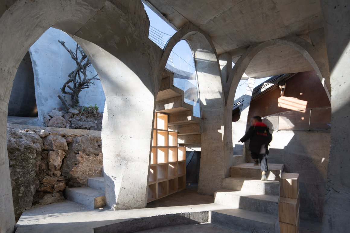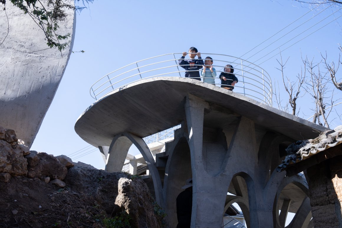 设计团队驻村,与村里匠人一起现场营造。在这里建筑即自然延伸,12mm螺纹钢编织成繁密的枝桠,拱形柱结构以树枝形态悬挑出屋面,与拐枣树冠构成虚实相生的双重穹顶。混凝土浇筑的拱顶向上生长,形成原始棚屋的庇护感,将“茅茨土阶”的材料更替为耐久混凝土,避免风雨侵蚀。在建造的过程中发现两个圆形屋顶相互交叠好似蘑菇,像这座大山里数不清的蘑菇,映射地域象征和趣味,让这个建筑充满了童趣。