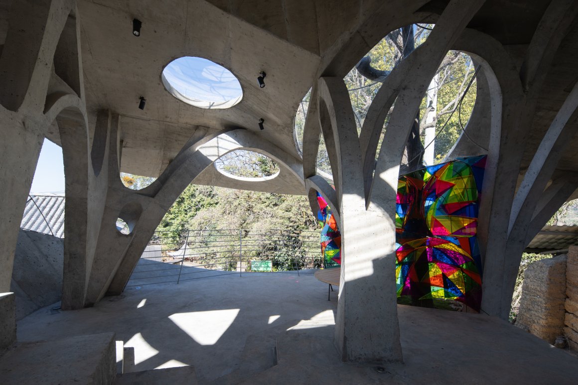 ▽混凝土浇筑的拱顶向上生长,形成原始棚屋的庇护感,在建造的过程中发现两个圆形屋顶相互交叠好似蘑菇,像这座大山里数不清的蘑菇 © Arch-translator